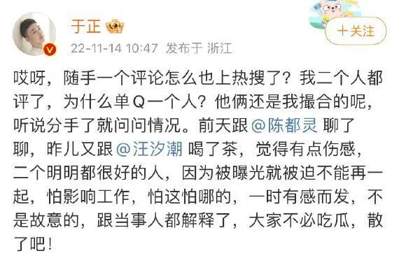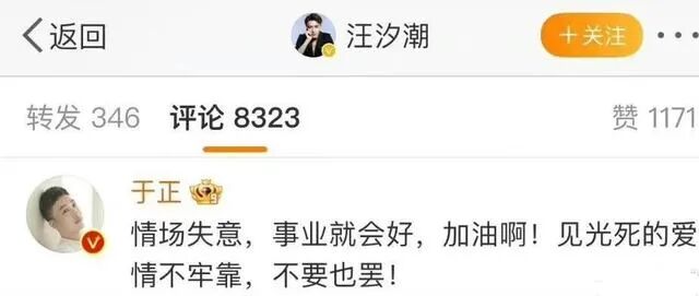 陳都靈那條微博發完之後,於正立馬跑到了汪汐潮的評論區安慰他:情場失意,事業就會好,加油啊!