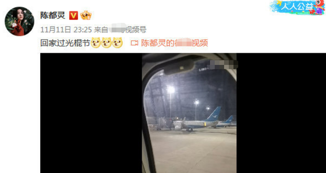 11.11號也就是光棍節那天,陳都靈發了條微博,配文是:回家過光棍節嘍。