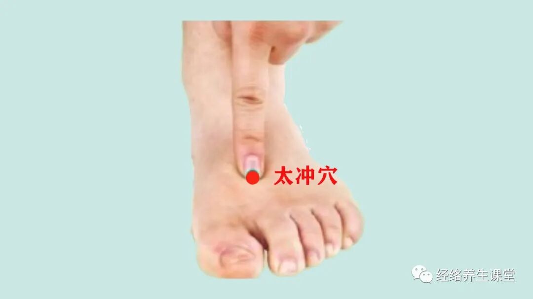 太沖穴:足背,沿第1、第2趾間橫紋向足背上推,感覺到一凹陷處即是。