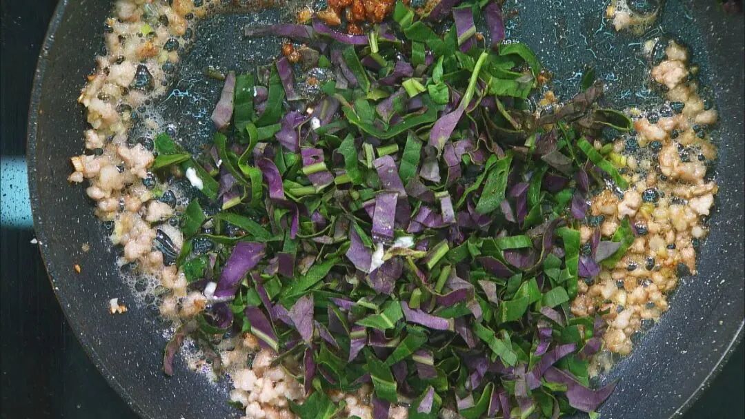 鍋中放油,放入肉末、血皮菜煸炒。
