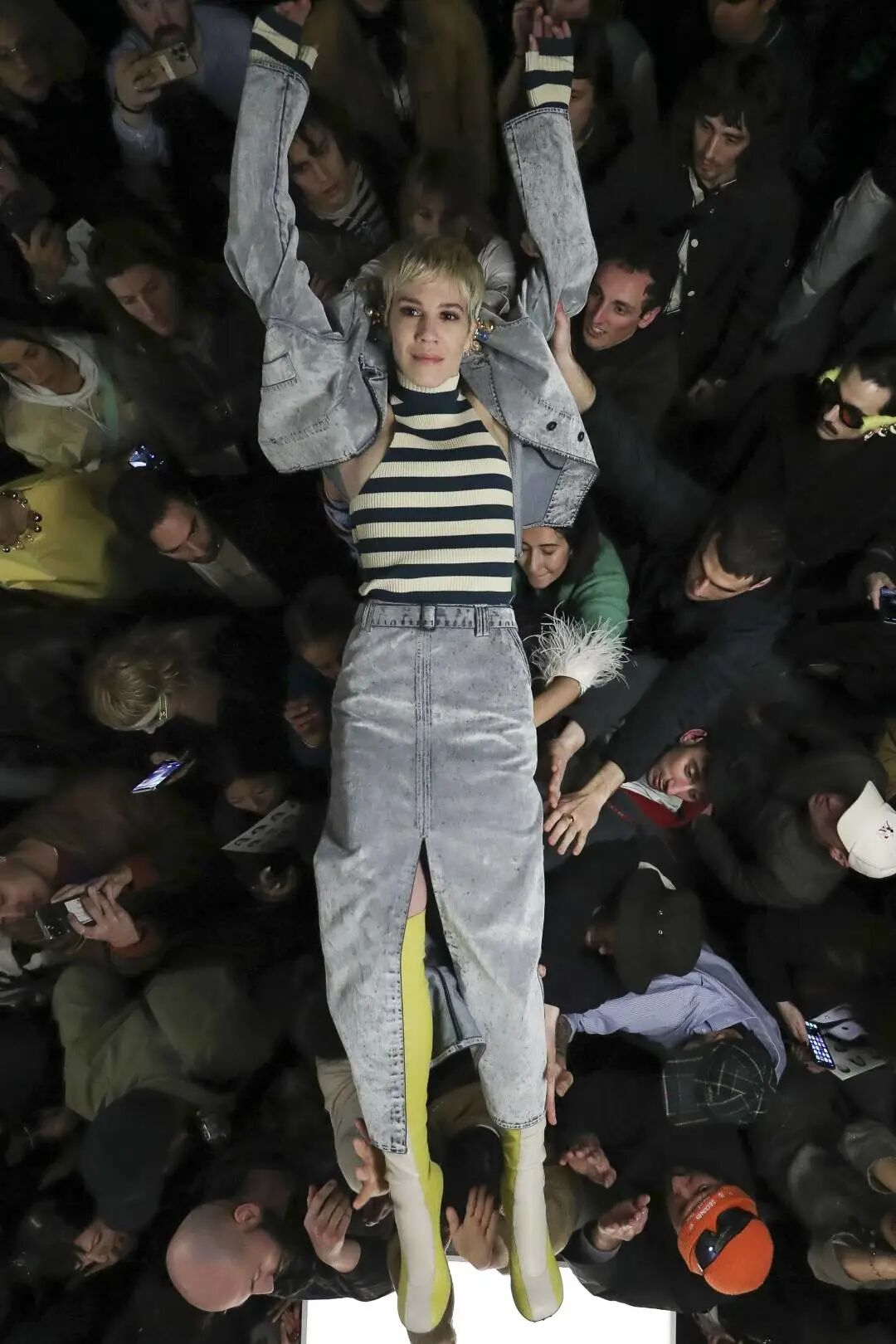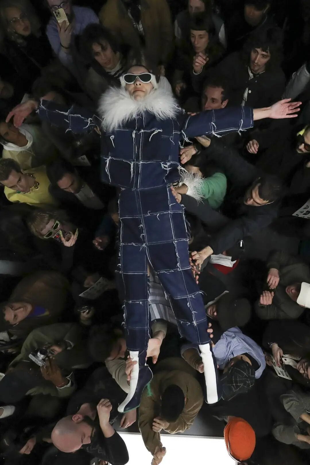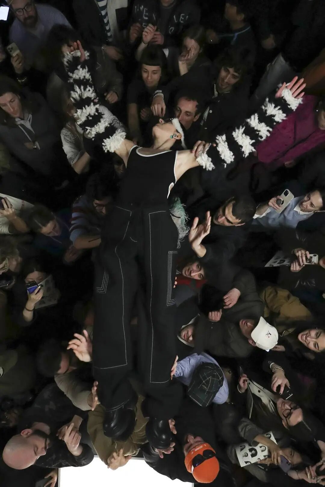 觀眾像沙丁魚一樣站在 T 臺下,由品牌的團隊成員組成的模特陣容穿著 2023 秋冬新衣,像搖滾歌手一樣從 T 臺縱身一躍, “跳水” 進入興奮狂熱的觀眾席。設計師說,這是一場關乎自由、信任、信心、冒險、互動、參與的秀,是為整個團隊準備的一場狂歡。