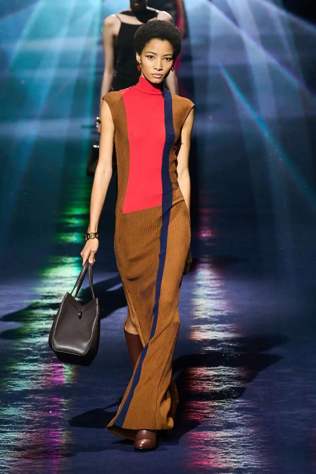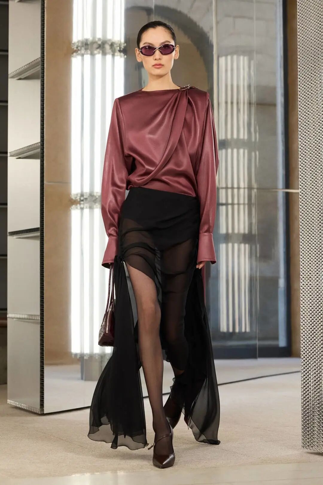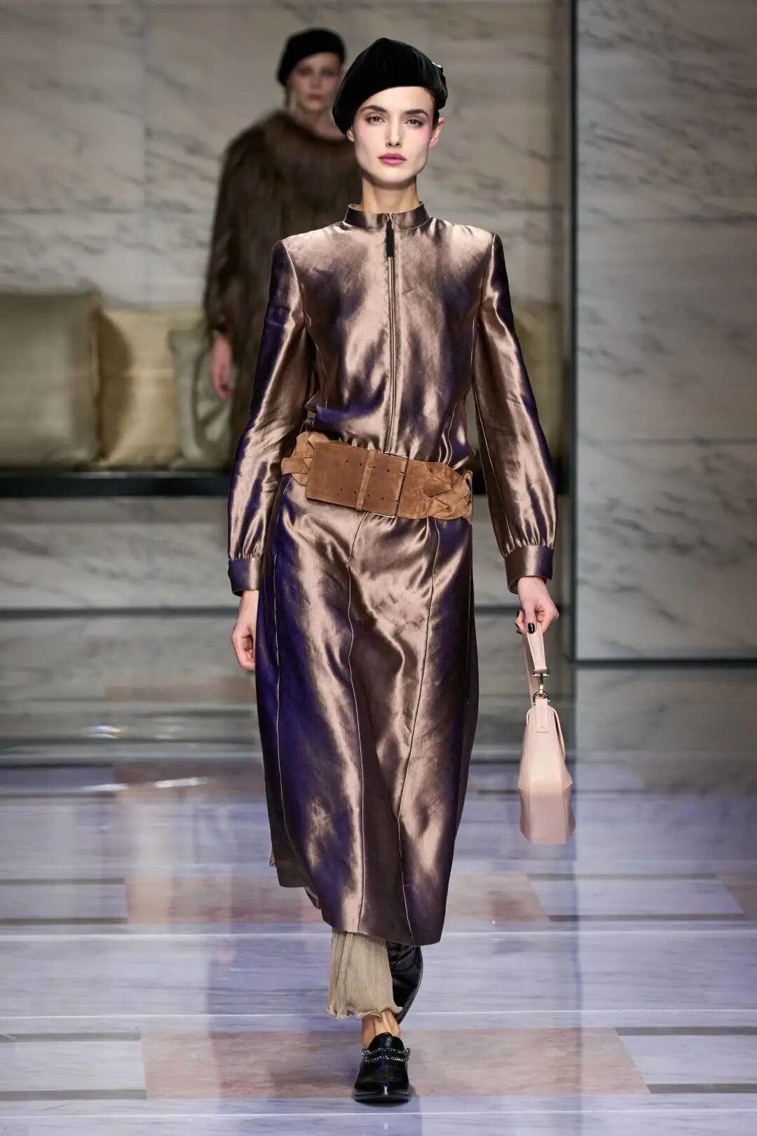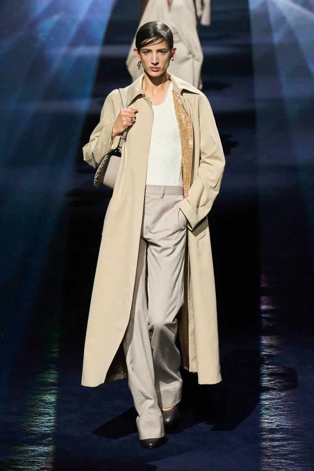 服裝廓形充滿流動性:絲質連衣裙、裹身披肩、柔和褲裝、套頭衫、修長夾克與長款連衣裙,遊走於大地色、粉色、橘色、青銅色等多變色調之中,如彩妝盤一般。