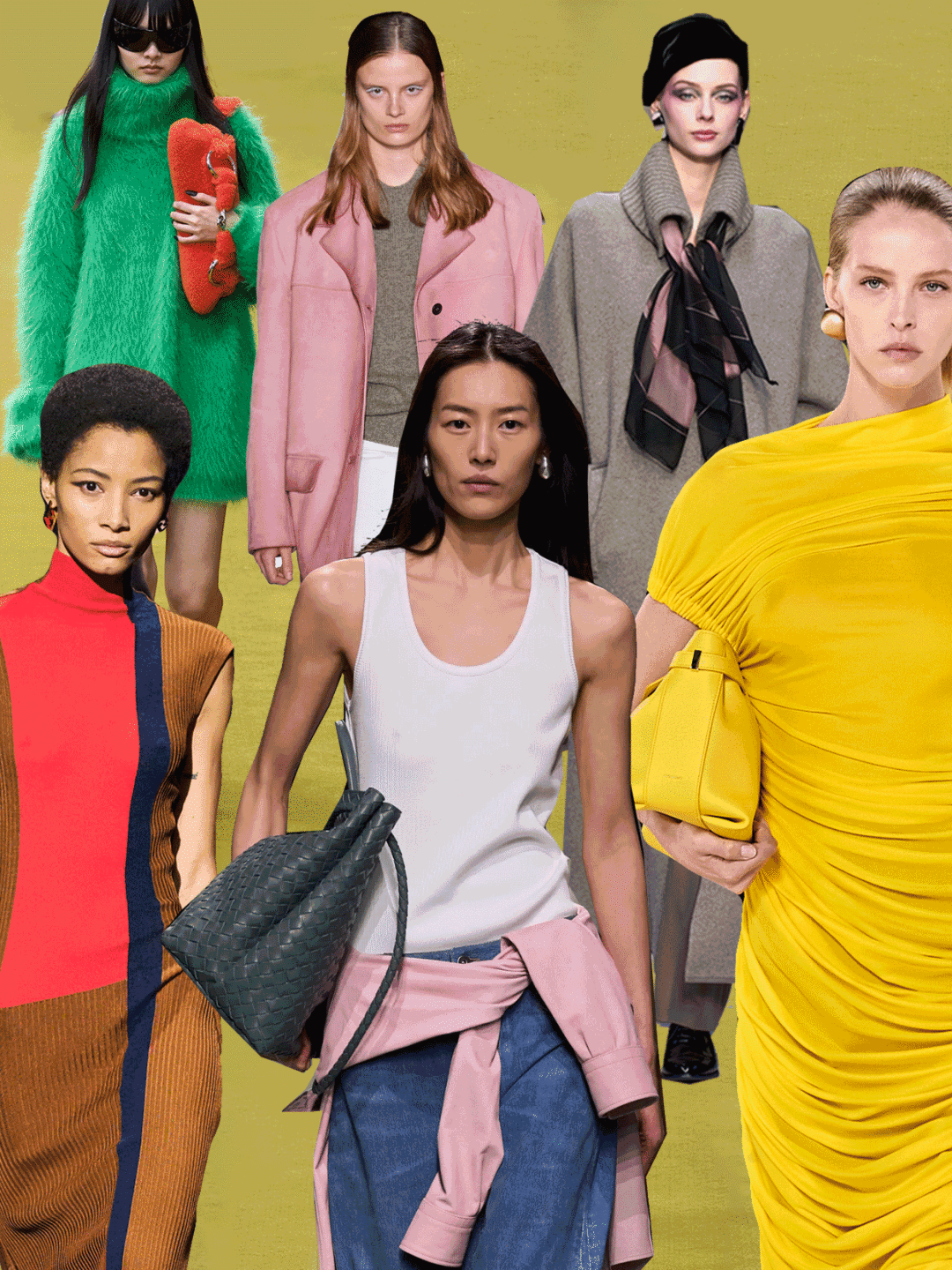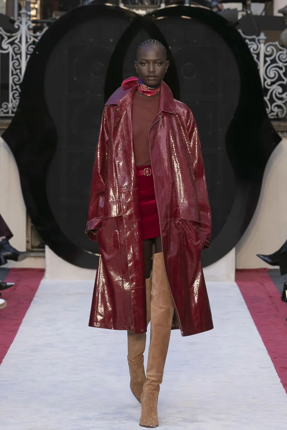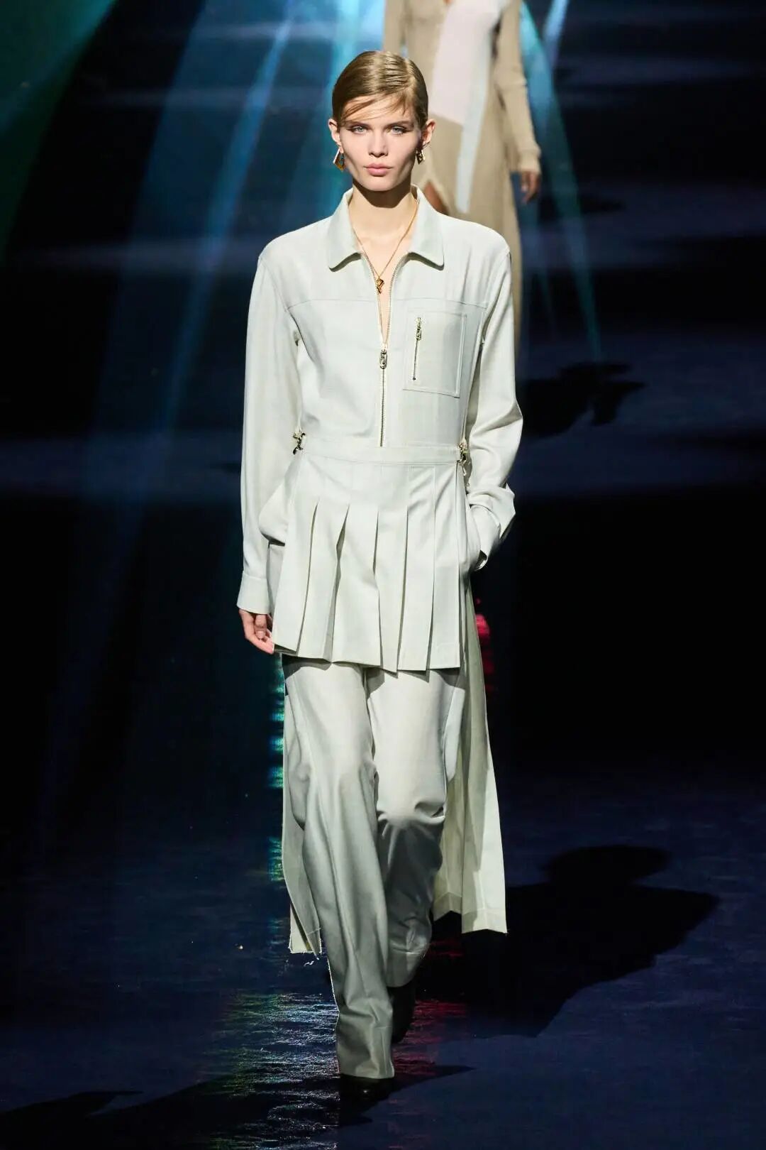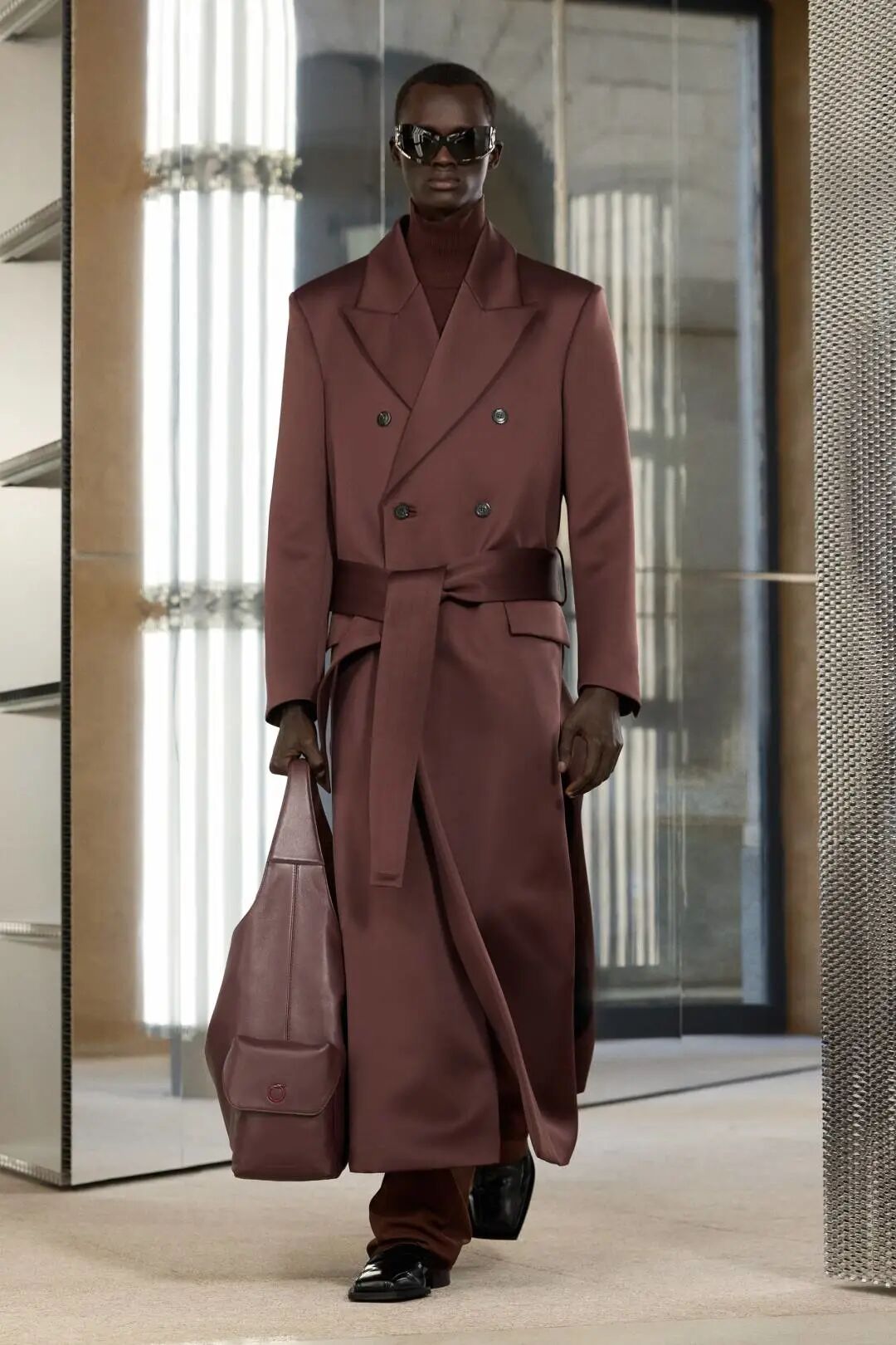 服裝廓形充滿流動性:絲質連衣裙、裹身披肩、柔和褲裝、套頭衫、修長夾克與長款連衣裙,遊走於大地色、粉色、橘色、青銅色等多變色調之中,如彩妝盤一般。