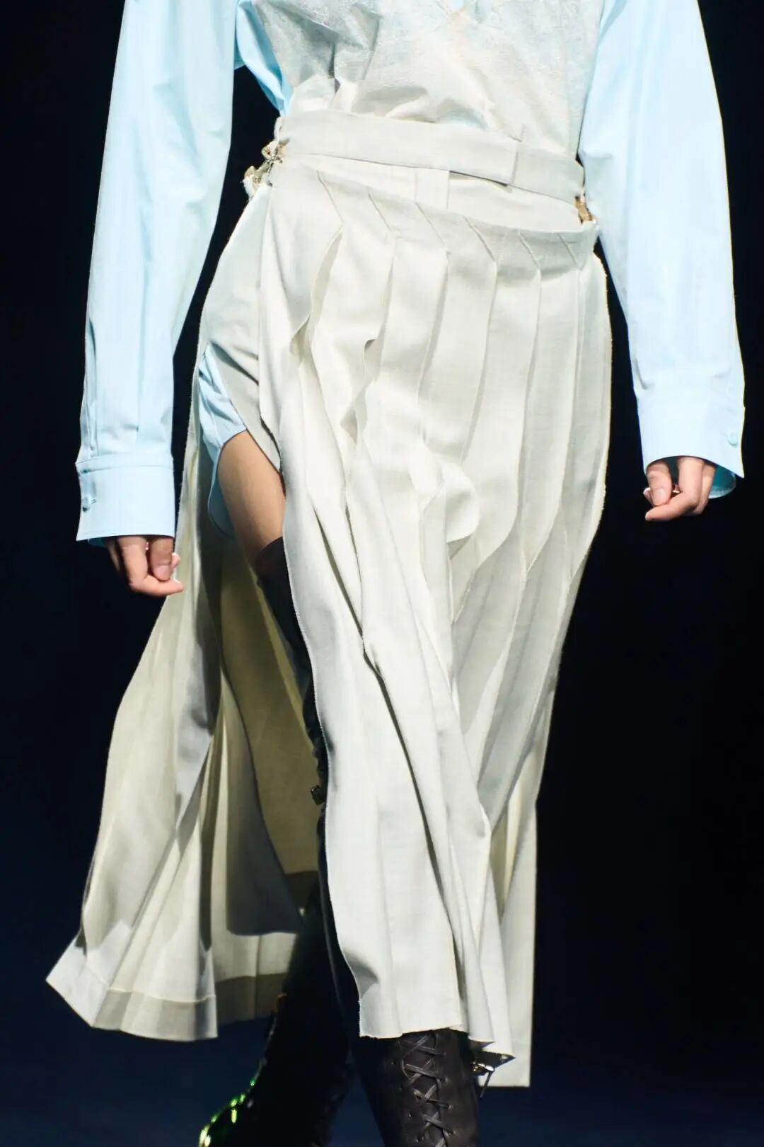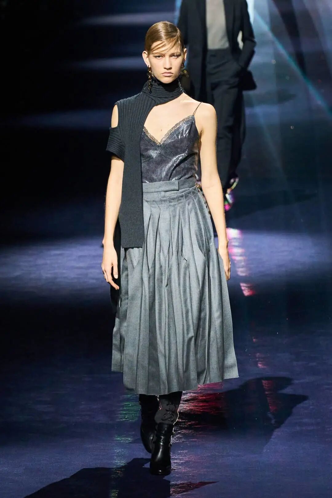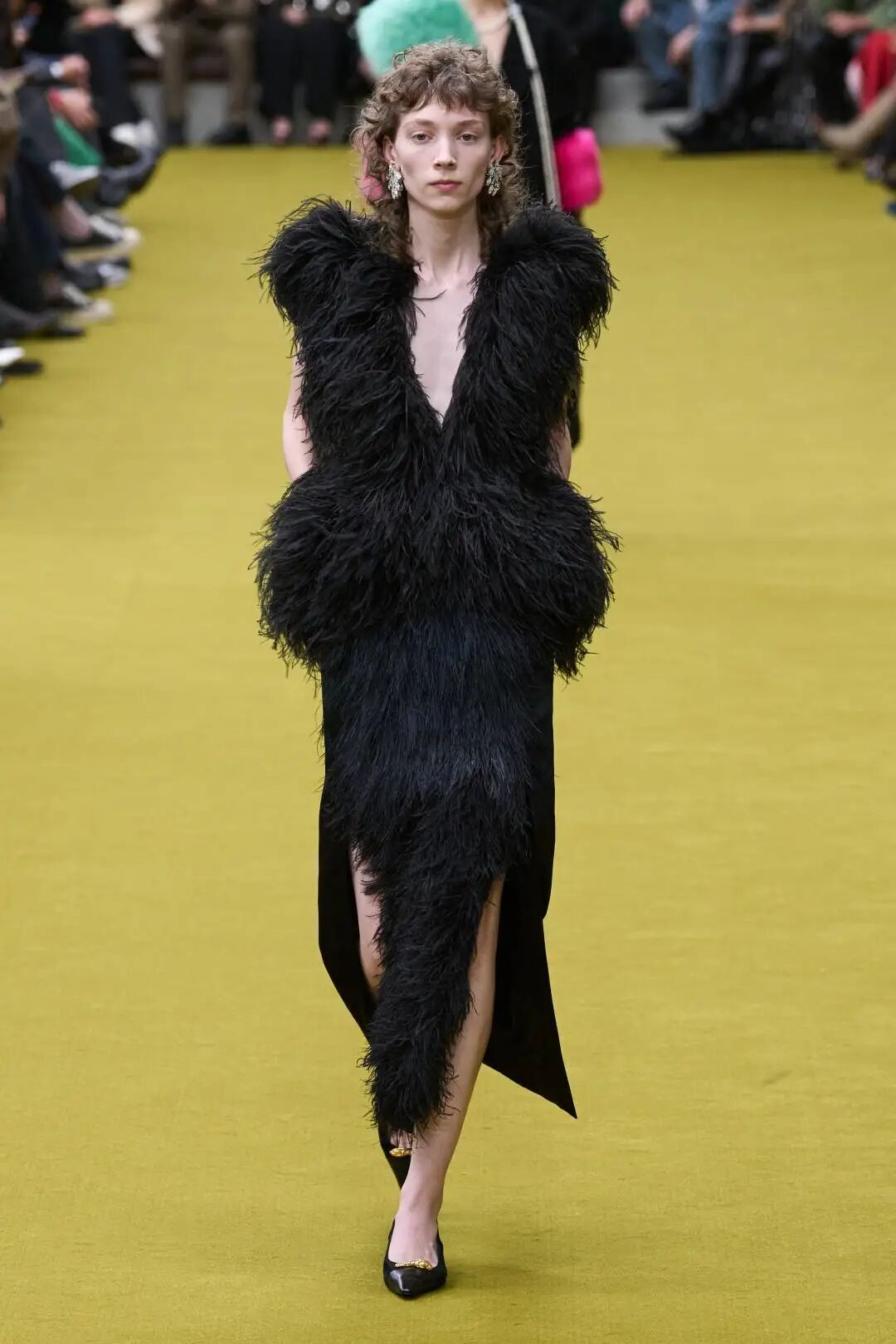 實用主義貫穿始終,剪裁利落的雨披裝飾有長而深的衩口;非對稱剪裁的垂褶連衣裙或波斯羔羊皮背心用綁帶的形式固定;朋克風格的針織衫呈現切口整齊的裂縫;羅紋針織衫解開紐扣斜搭在肩上;褶皺形式的緞布連衣裙搭配波浪造型的的圍巾,浪漫奔放。