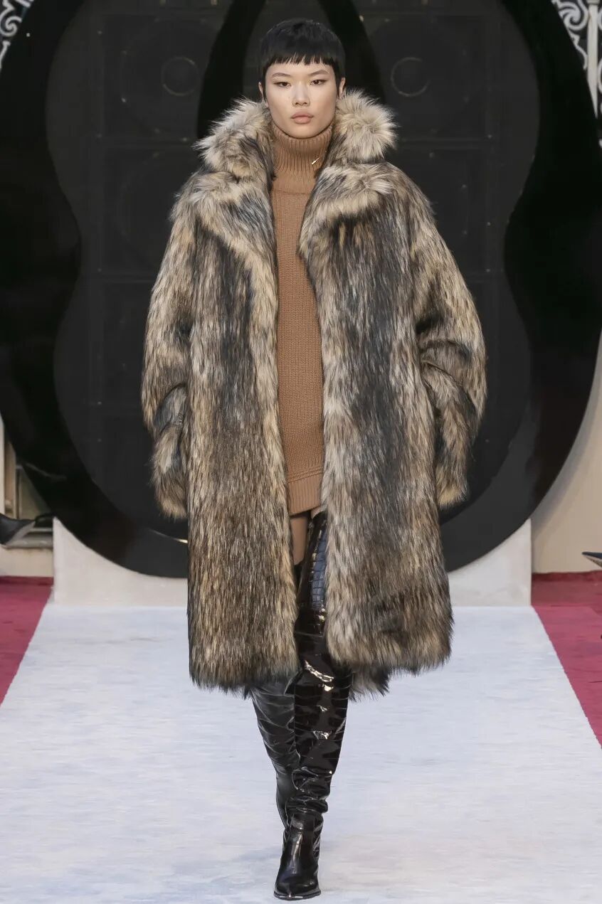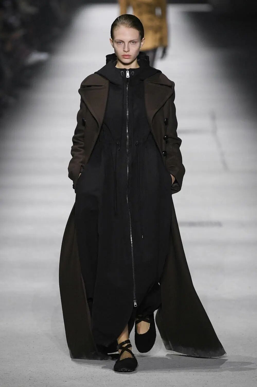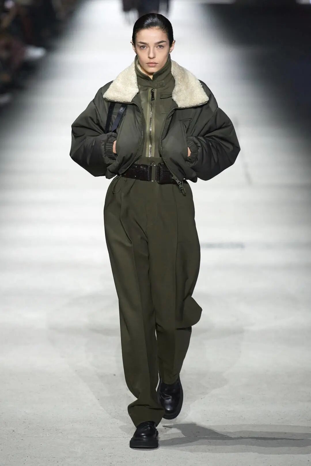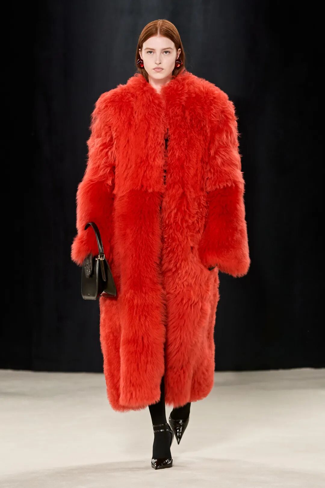 實用主義貫穿始終,剪裁利落的雨披裝飾有長而深的衩口;非對稱剪裁的垂褶連衣裙或波斯羔羊皮背心用綁帶的形式固定;朋克風格的針織衫呈現切口整齊的裂縫;羅紋針織衫解開紐扣斜搭在肩上;褶皺形式的緞布連衣裙搭配波浪造型的的圍巾,浪漫奔放。