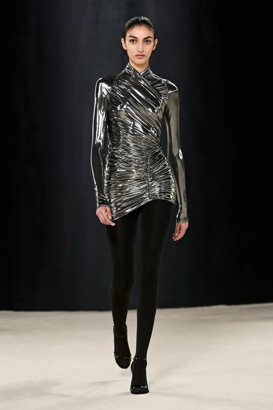 比如,這個系列借鑑自藝術家 Lucio Fontana 《空間概念》系列作品的刀割元素,在衣服上隱藏一線亮色,再比如包袋和首飾上流線型的樹脂元素,以及金銀線迷你裙、漆皮裙裝……