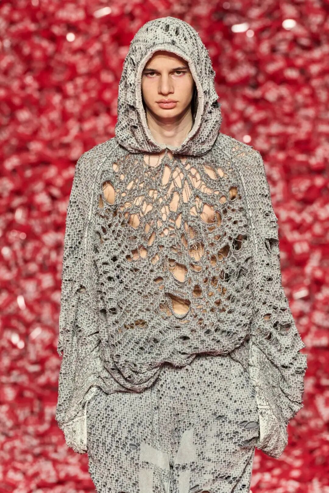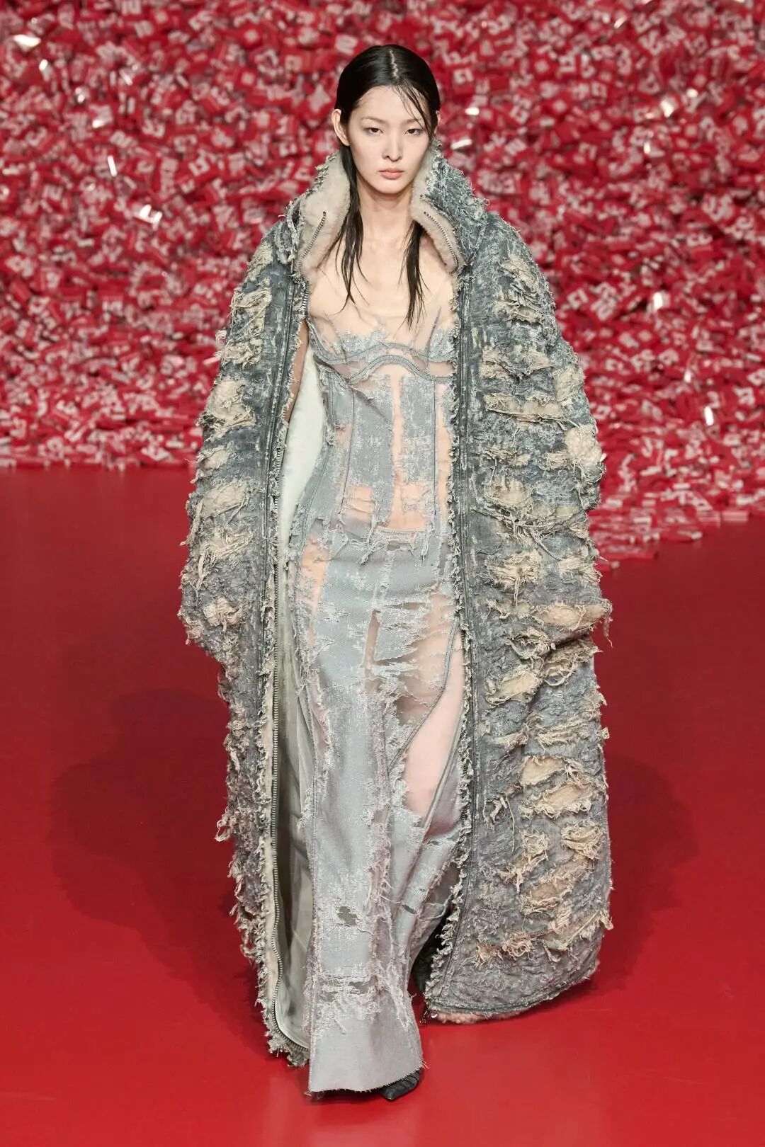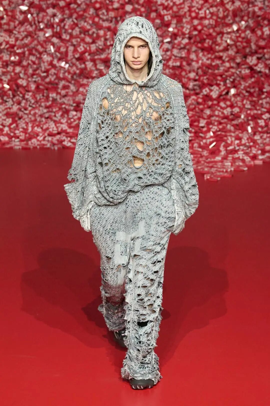 秀場中央堆滿了 200,000 個猩紅色杜蕾斯紙盒,充滿視覺衝擊力。整個系列都在探索自由、快樂和實驗的主題。模特穿著經過特殊處理的歐根紗丹寧面料、印有搞怪的人臉的數碼印花、塗抹金屬色澤顏料的皮革材質,展現著 Glenn Martens 帶給新世代的性感。