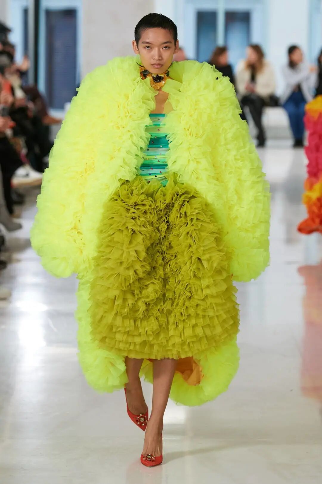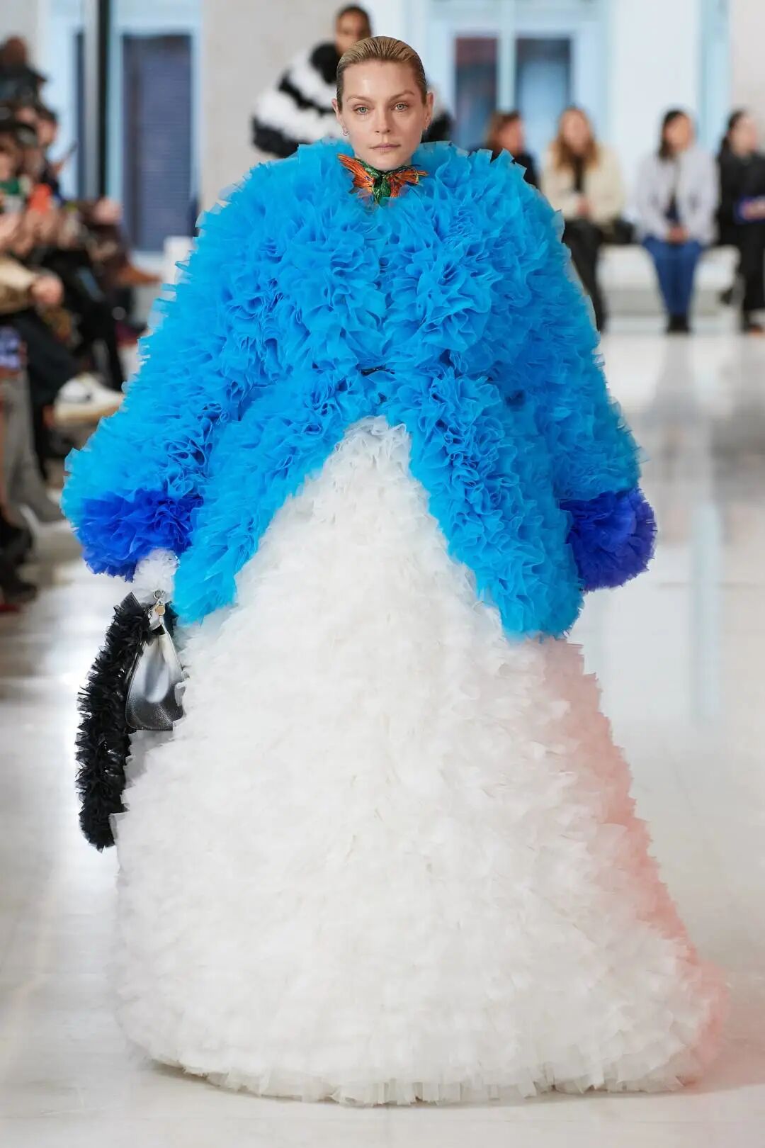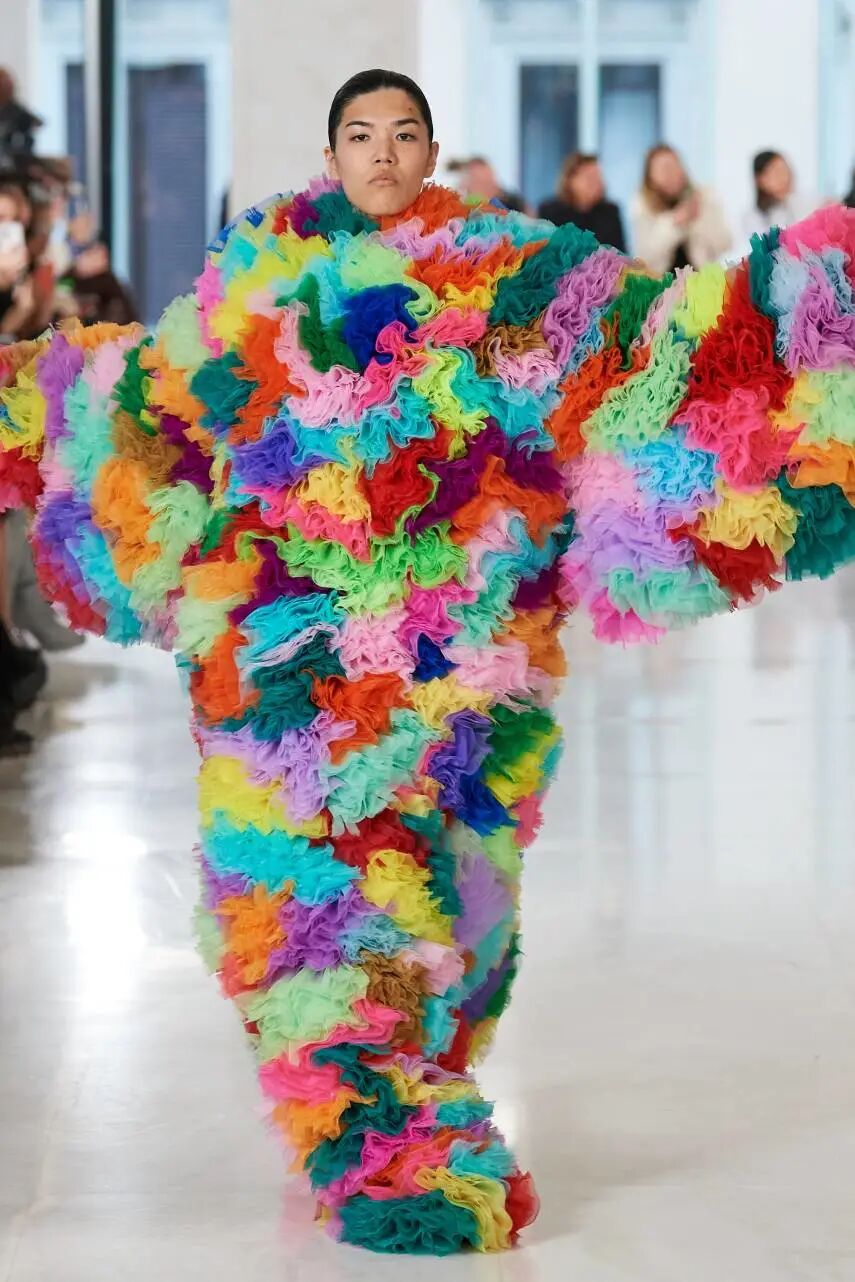 這種蓬鬆、大體積的裁剪手法是 Tomo Koizumi 獨創的 “Tomo 植絨” 縫製方法,一次將布料縫合好幾英寸,使得大量布料像杯子中的水一樣爆裂溢出,充滿體積感,成為他最標誌性的設計元素。