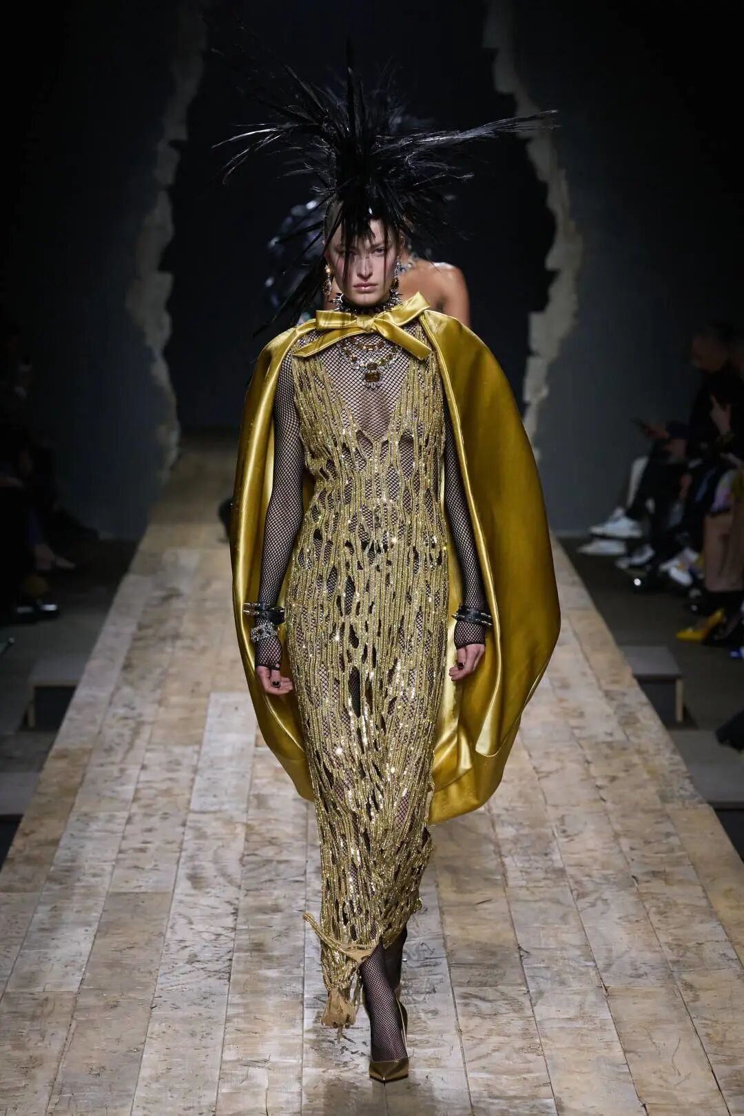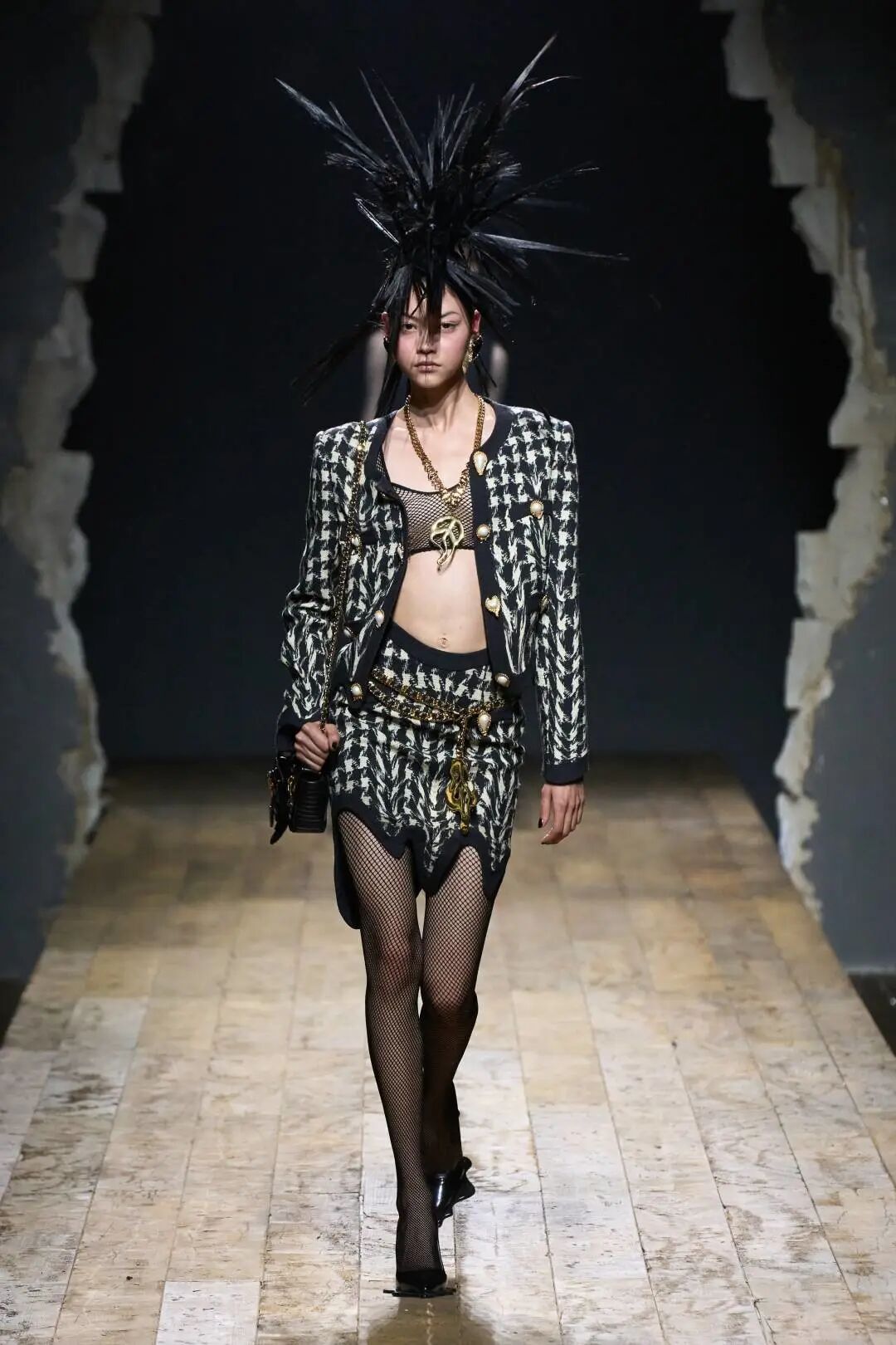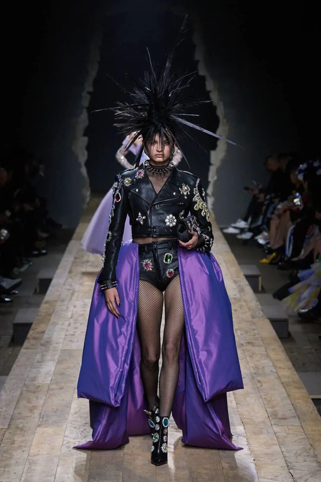 充滿頹廢氣息的朋克精神也是這一季的重要主題:在成衣肩縫和裙邊處增加尖刺和鉚釘設計;在薄紗裙襬上繡滿珠寶首飾;復古流蘇連衣裙…這是一種帶有超現實主義色彩的叛逆先鋒感,也是一種被不守舊的皇室精神所浸染的反叛精神。