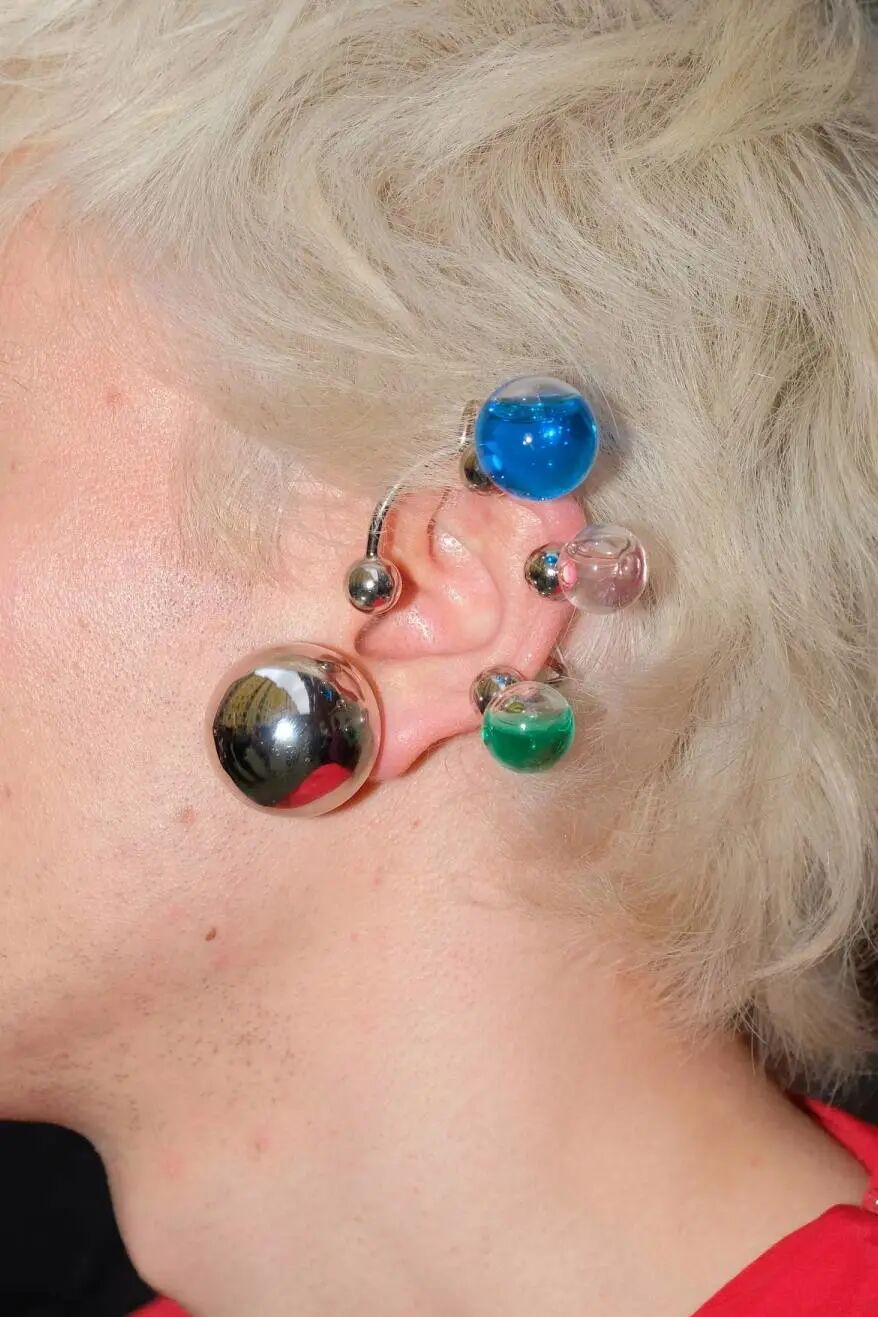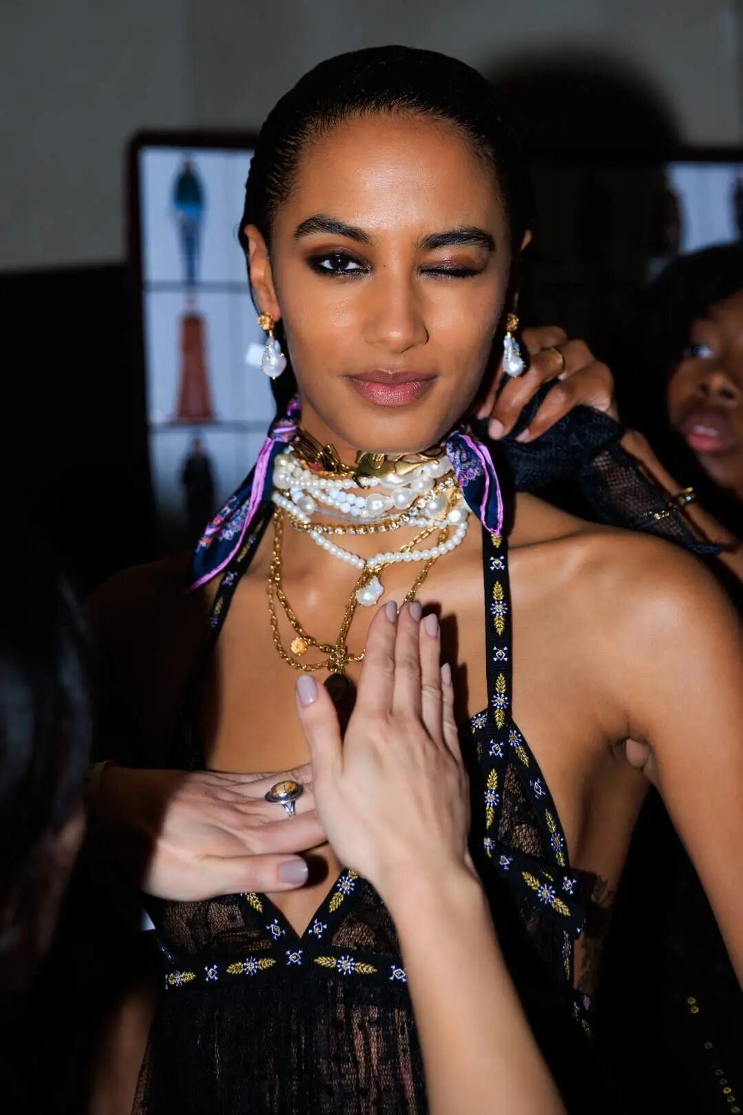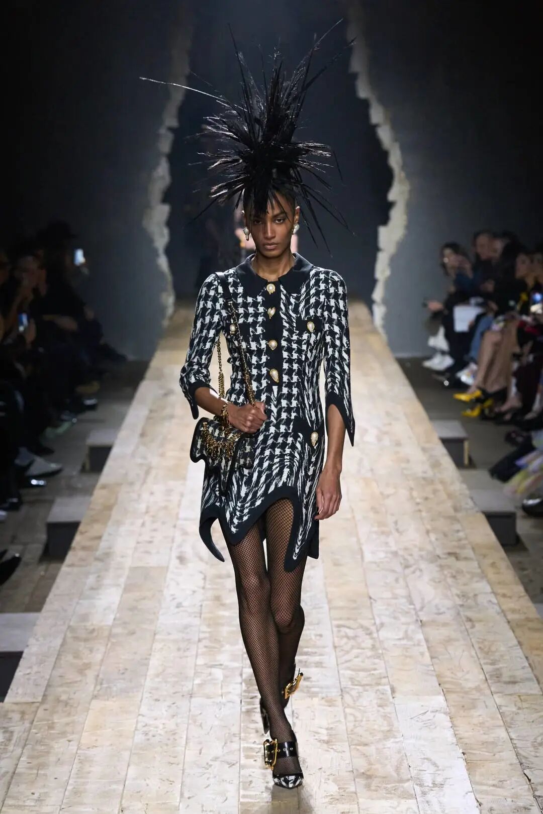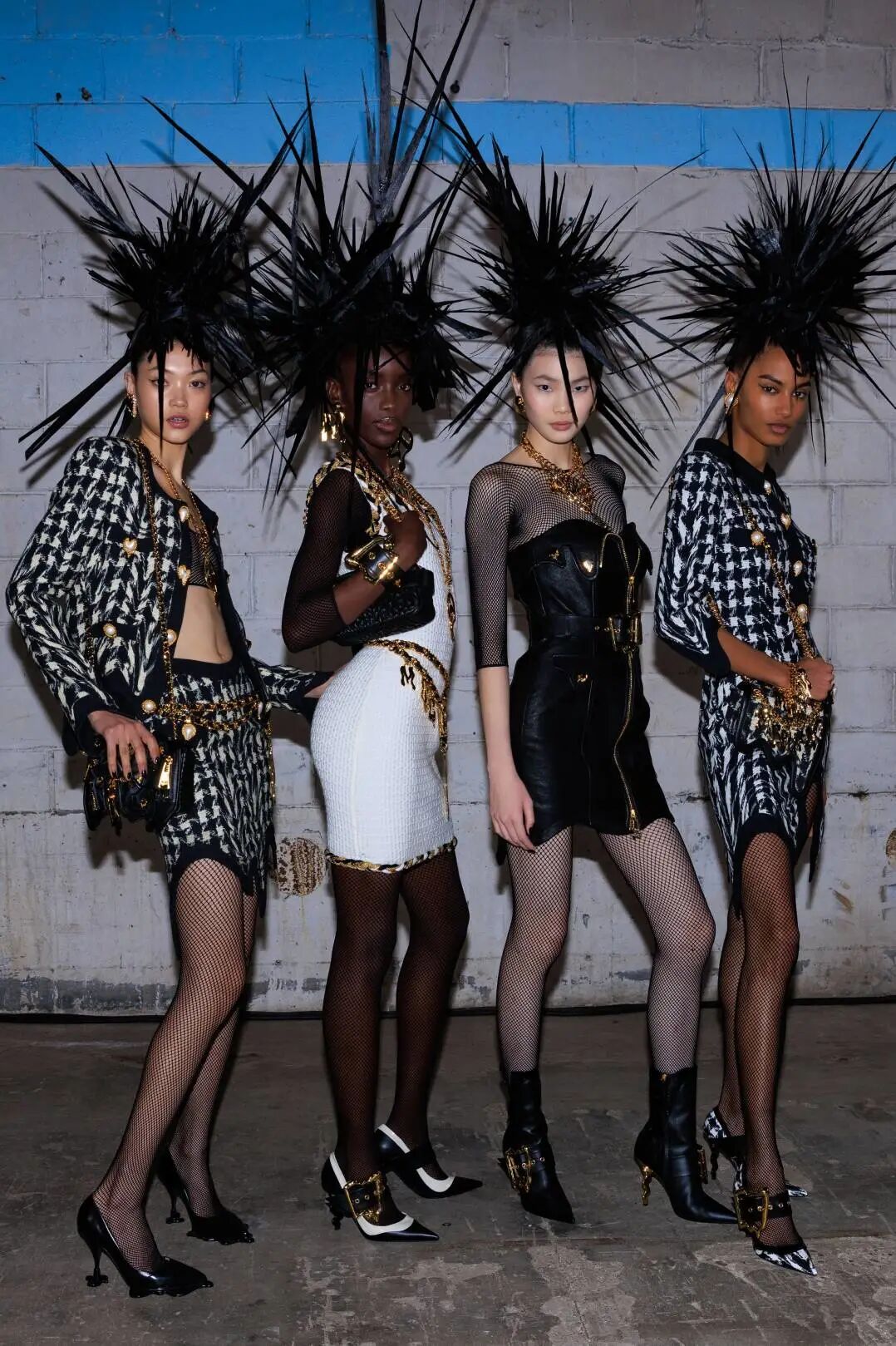 充滿頹廢氣息的朋克精神也是這一季的重要主題:在成衣肩縫和裙邊處增加尖刺和鉚釘設計;在薄紗裙襬上繡滿珠寶首飾;復古流蘇連衣裙…這是一種帶有超現實主義色彩的叛逆先鋒感,也是一種被不守舊的皇室精神所浸染的反叛精神。