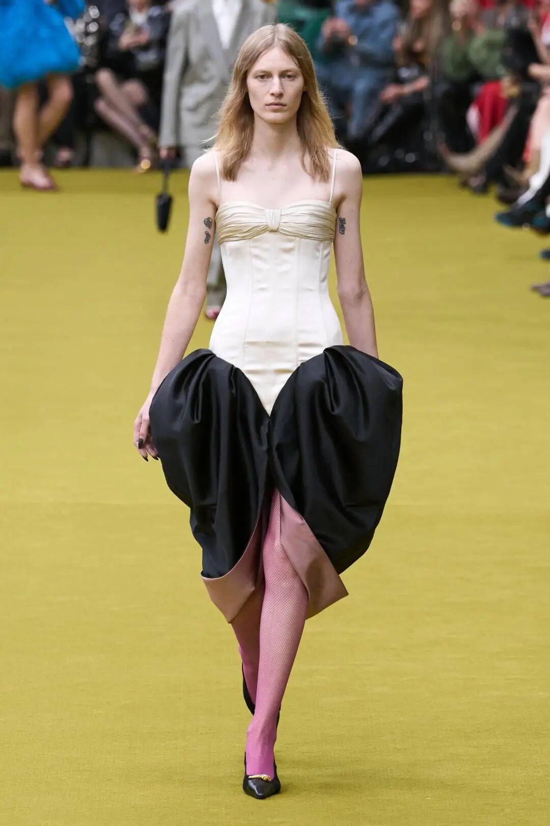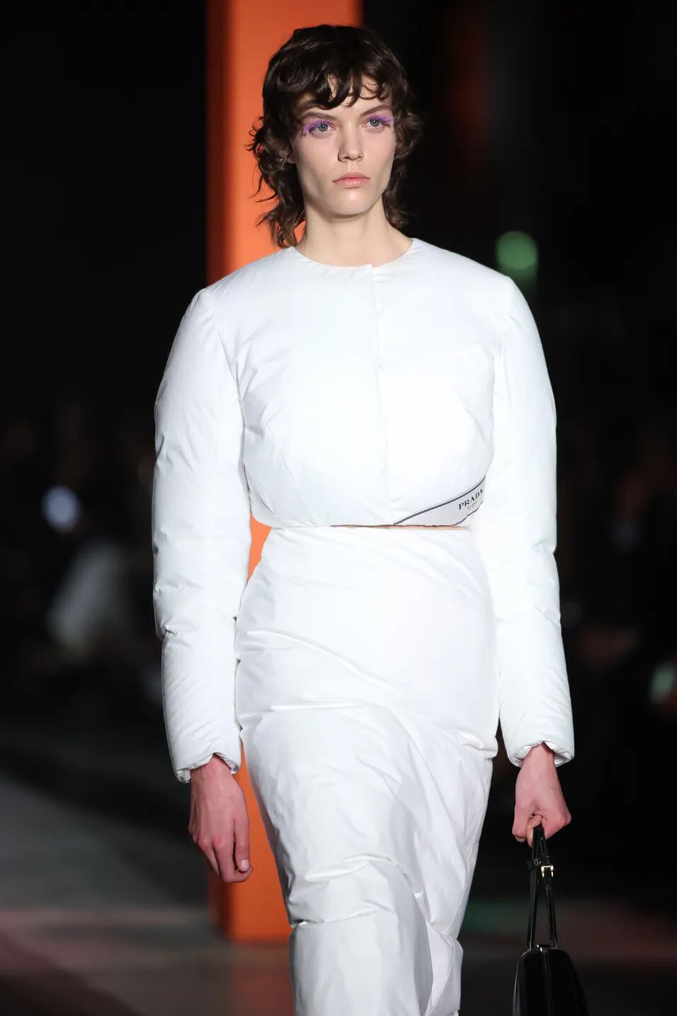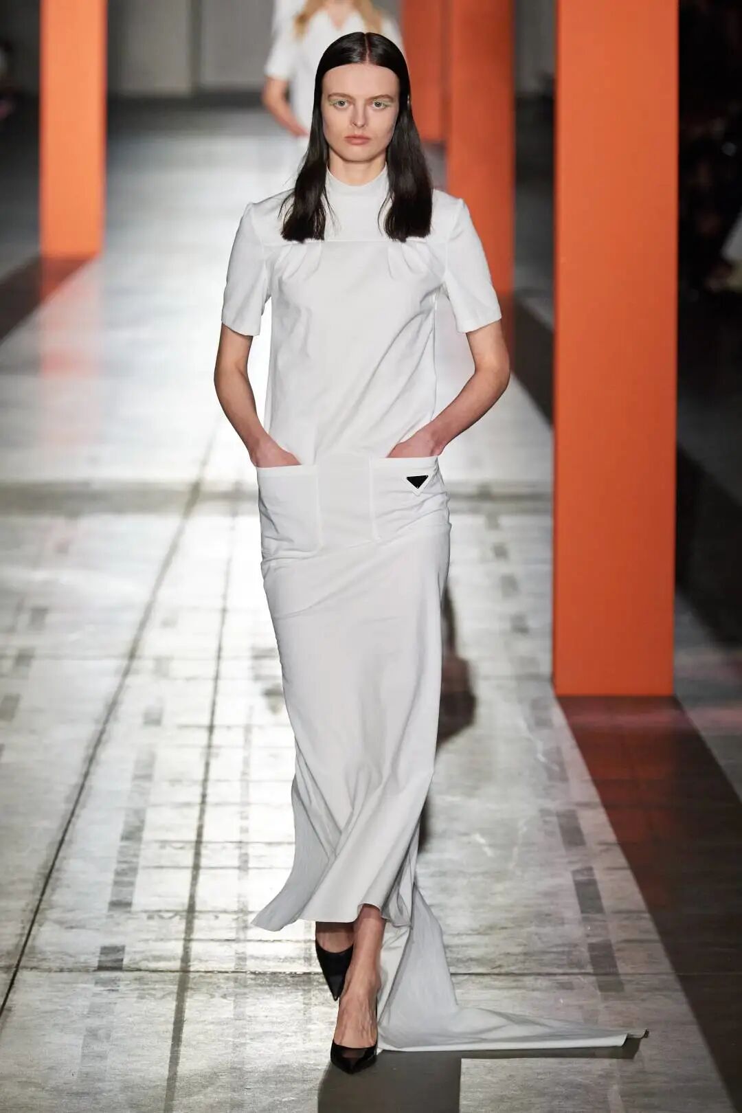 廉價的護士服、呆板的軍裝制服變身禮服,上班通勤裝搭配了如婚紗一樣精緻的半裙。Prada 打破了正式與非正式之間的藩籬,使尋常與特別的著裝彼此對話。