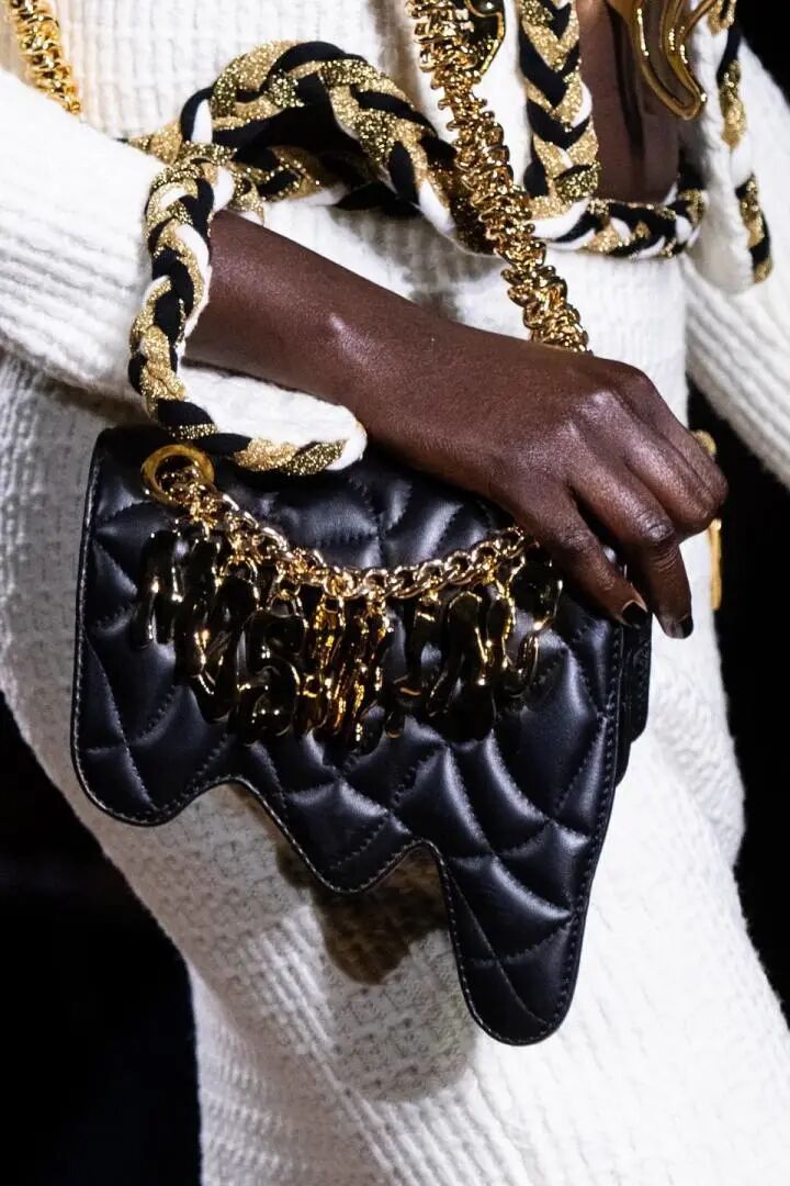 Moschino 的標誌性產品都在全新設計之下被熔化和修改重組——千鳥格外套與短裙的衣襬是如水滴般的液態形狀,手袋也做成不規則流動形態。