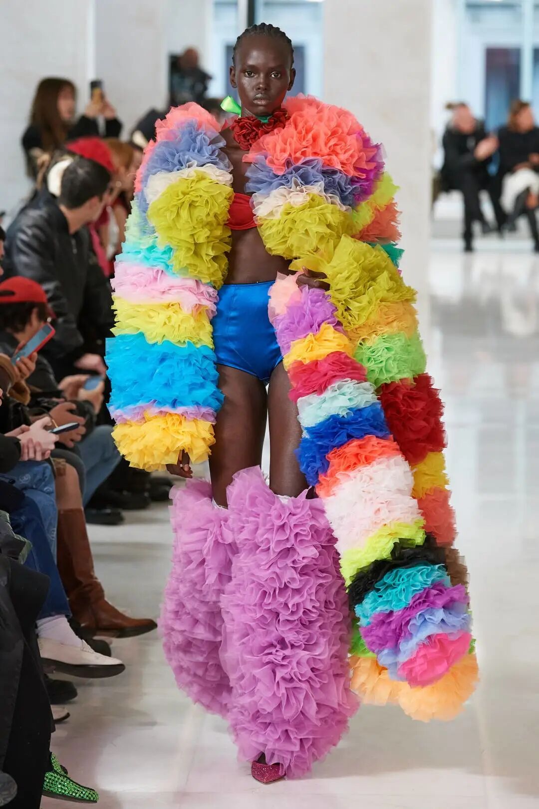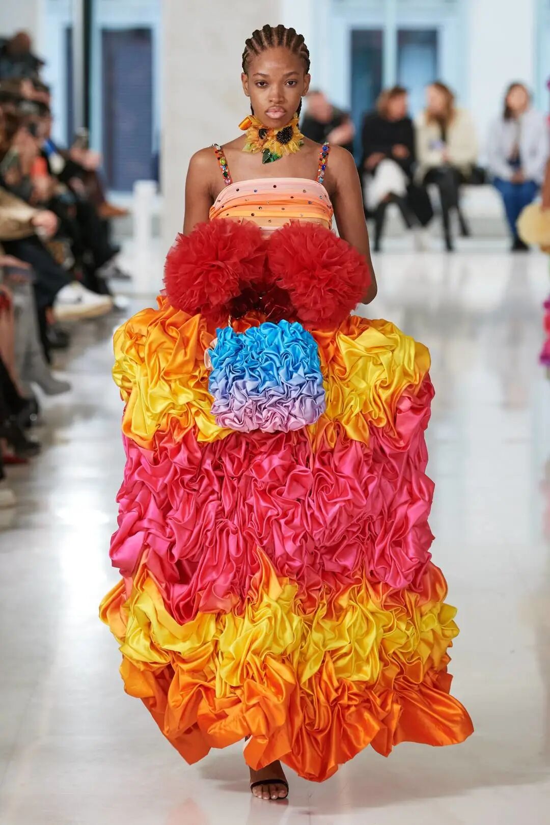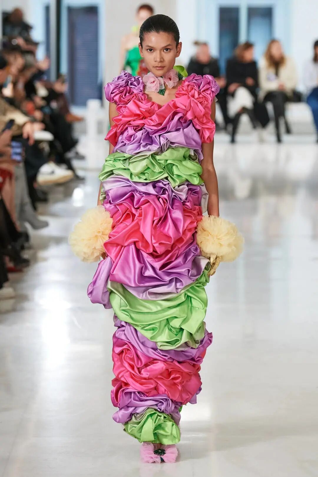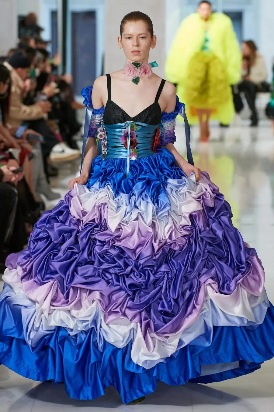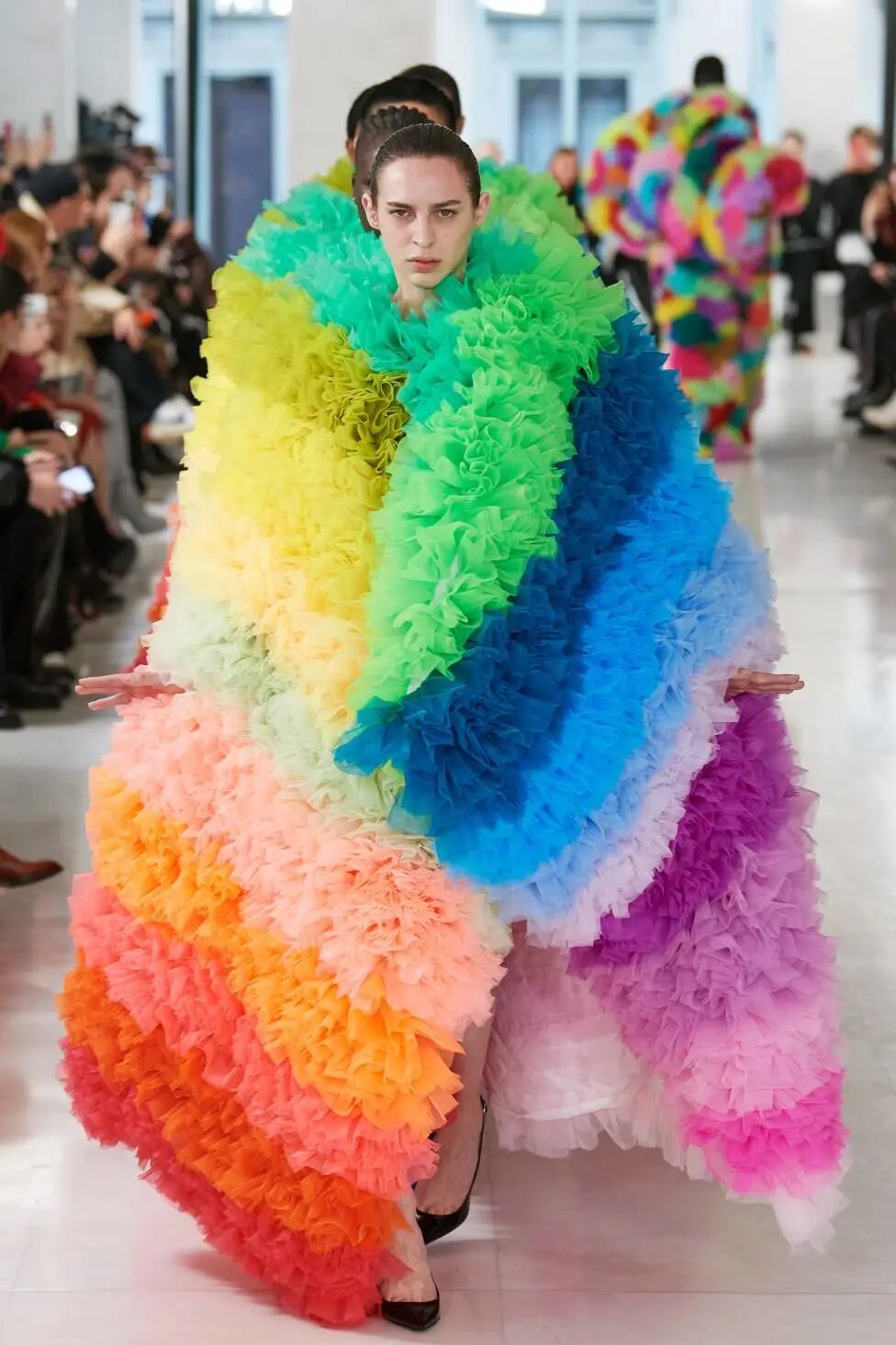 秀場在 Dolce & Gabbana 米蘭總部,設計師將這個系列命名為 “Don't Forget to Bring Your Flowers(不要忘記帶上你的花)”,模特們在 T 臺上穿著五顏六色、蓬鬆夢幻的超大號禮服,像彩虹一樣絢爛。設計師說,這是他送給米蘭人民的花束。