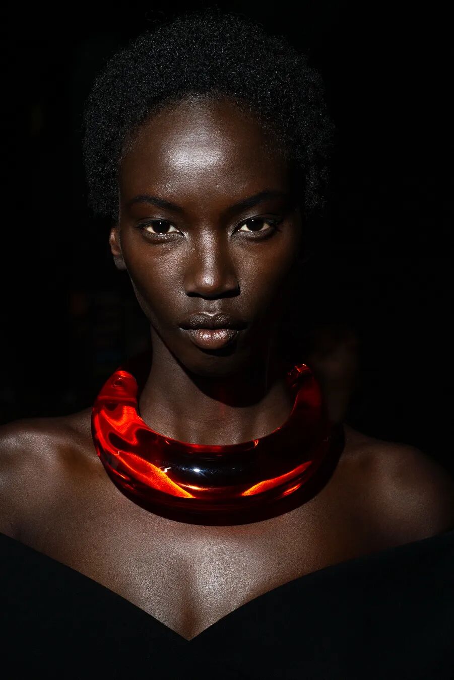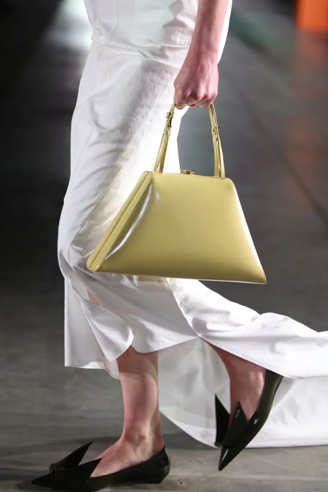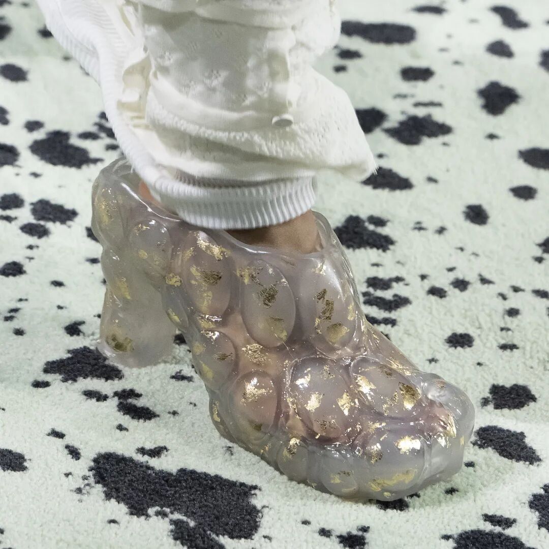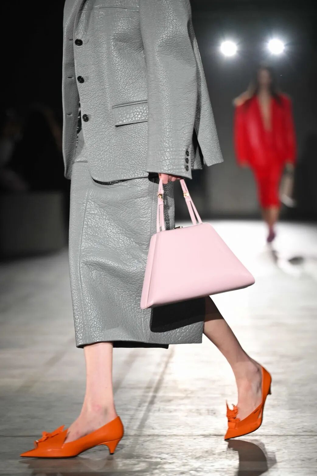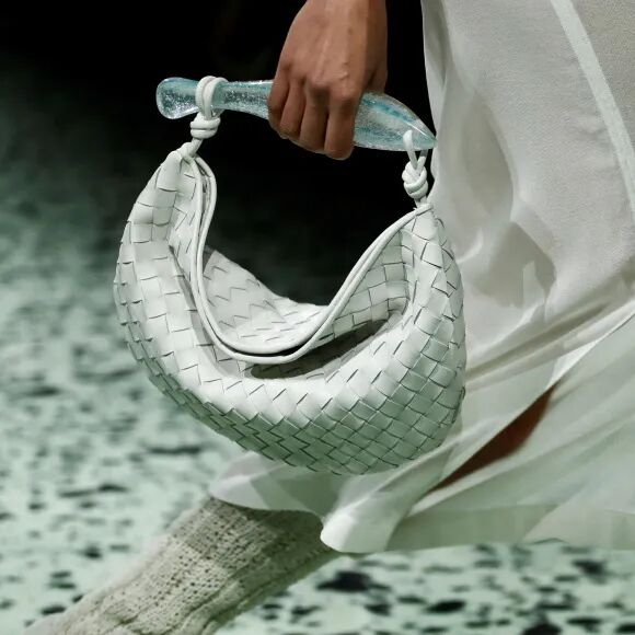“擬態”建立了 Bottega Veneta 的新宇宙。在這個宇宙裡,時裝顛覆了肉眼可辨的“價值”:看起來平價的單品在工藝上可能極度複雜昂貴(如看起來像棉布睡衣一樣的皮革襯衫套裝、如針織襪的皮靴),而那些 Sardine 手袋上宛如珠寶的把手只是 Murano 玻璃。Bottega Veneta 的價值不來自於“被看”。