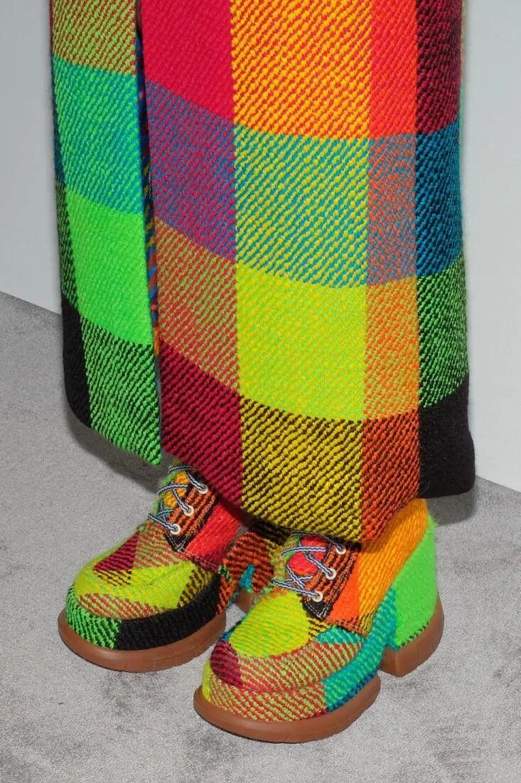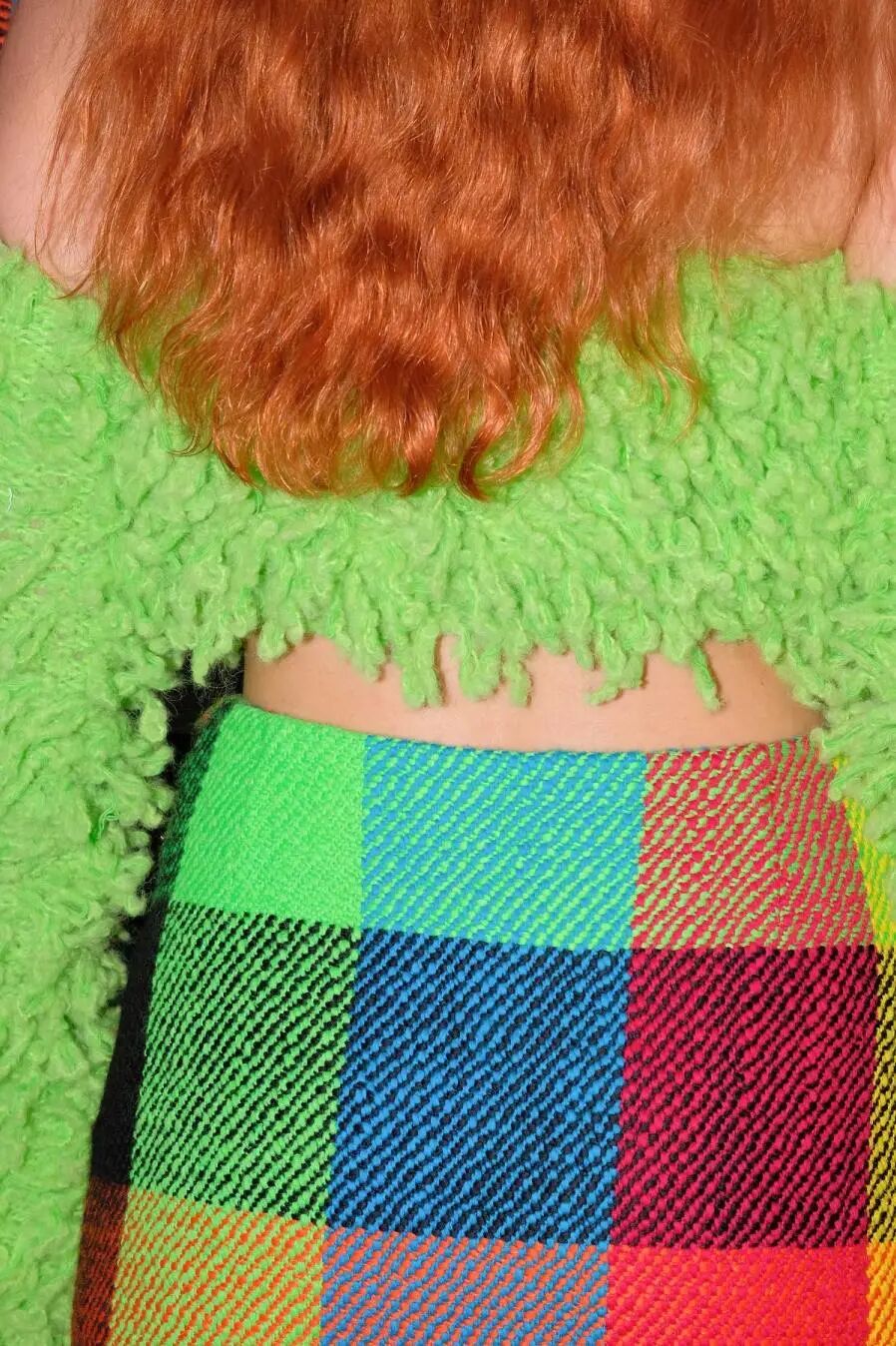 系列的單品採用大量充滿活力的配色和圖樣,包含彩虹色方格外套、絲絨西裝、露臍上衣,以及帶有茸毛細節的圍巾、手套、墨鏡等配飾,耳環也充滿色彩趣味,充滿活力。