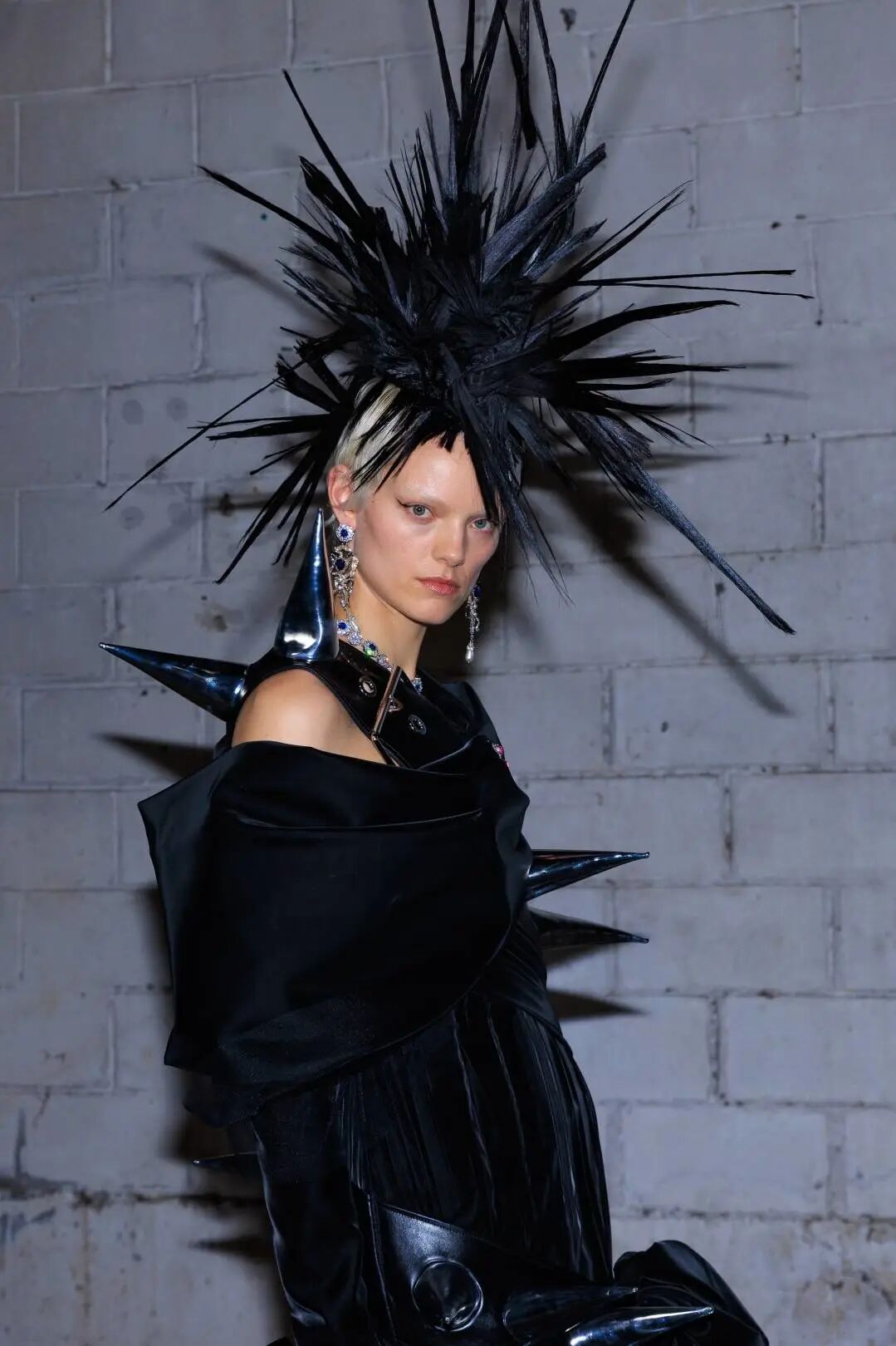 廓形尖刺設計,模特頭戴的莫西幹頭飾,滿布的珠寶配飾,誇張變形的裙襬——這一季是關於 “扭曲” 的時尚戲劇。這是從 Dali 的著名畫作 《記憶的永恆》 中得到的靈感。