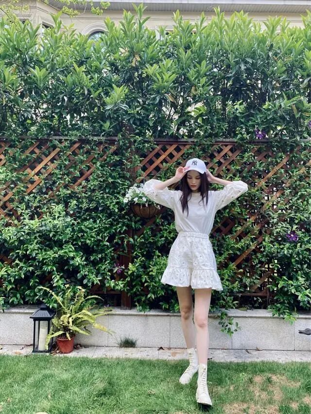 短褲秀出她的那一雙筆直修長的天鵝腿,褲腿處運用了花苞狀的收口設計,凸顯出何穗俏皮甜美的一面,具有一定的減齡作用,加以白色鴨舌帽與運動鞋搭配,青春氣息撲面而來。