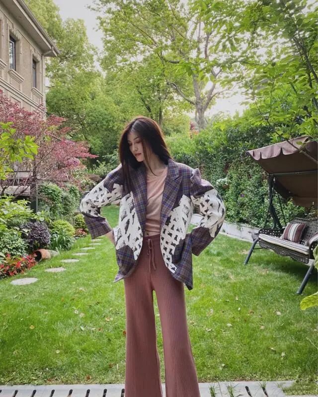 休閒風一直是何穗私服搭配中鍾愛的風格,闊腿褲能夠有效的遮擋住腿部的贅肉,針織的面料具有一定的垂墜感,起到延展的作用。