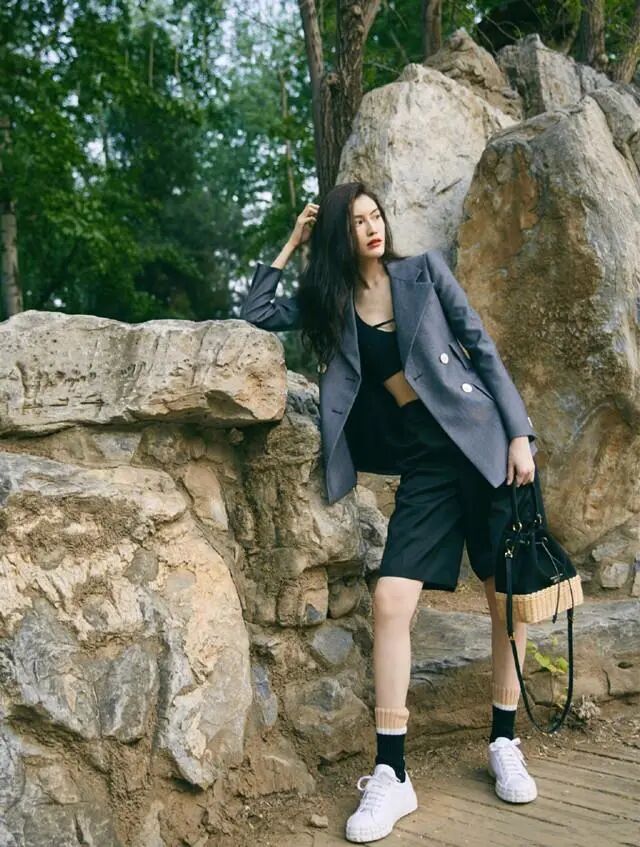 何穗很懂搭配,一件件普通的單品在他的加工下變得不再平凡,鉛筆灰的西裝很符合現在流行的性冷淡風格,這種純色的衣物凸顯大氣幹練,墊肩的設計能夠修飾肩部線條,提升氣場,內搭運動風胸衣,突出她傲人的上圍和性感的小蠻腰,下半身何穗選擇了一條五分褲,寬鬆的版式把她的腿部贅肉遮蓋住,將腿部線條修飾的十分優美,既有少年感的帥氣又不乏女人的性感。
