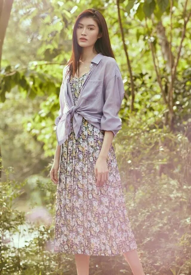 今年大火的碎花元素自然是少不了受到時尚達人何穗的青睞,寬鬆的碎花裙具有一定修飾身形的作用,襯得何穗格外的小鳥依人,V領的設計能夠拉長她的頸部線條,使他瞬間擁有天鵝頸,外搭薄紗防曬衣,清透的面料為何穗的整體造型增添仙氣,淡紫色的基調將她本就白皙的皮膚襯得更加通透,衣角在腰部處隨意打結,不但富有慵懶感,還能夠完美的勾勒出何仙姑纖細的腰身。