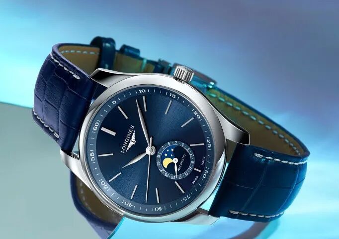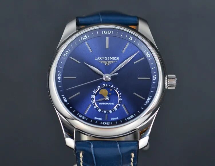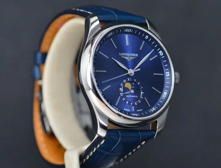 這隻腕錶是名匠系列的新品之作。與以往麥粒紋錶盤樣式不同,這隻全新的月相腕錶則採用了藍色太陽紋裝飾盤面,更加靚麗。圓形藍色盤面優雅大方,太陽紋裝飾盤面,使得腕錶在不同光線的照射下,形成光影互動的效果、光彩熠熠,盤面搭配鍍銀拋光指針,12點位置下標誌性的“飛翼沙漏”標識,整體佈局和諧美觀。這隻腕錶的表徑為40毫米,內部搭載L899專屬自動上鍊機械機芯,走時穩定。