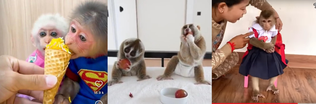 在社交媒體反動物虐待聯盟(SMACC)的一個調查案例中,有5只年輕的寵物猴子,被博主餵養在一個鐵絲籠子裡,幾乎不提供任何食物和水。
