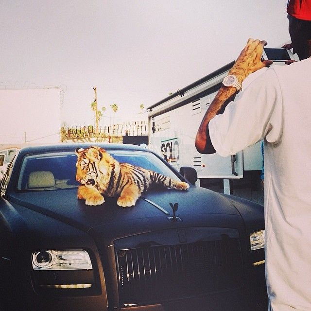 趴在勞斯萊斯上的寵物孟加拉虎,對它拍照的人手上還戴著勞力士,說唱歌手Tyga在一張照片裡,就拿捏了炫富需要的多種要素。