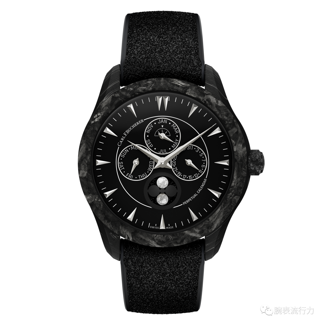 神秘,自信,帶有稜角的溫柔,新時代摩登女性所具備的特質,在馬利龍外緣動力萬年曆黑色限量版腕錶中同樣得以體現。鍛造碳纖維錶殼與鈦金屬內殼,配備萬年曆和月相功能;砂金石小錶盤搭配兩片手工雕刻白金材質的小月亮圖案,暗藏精緻的反差感。混合橡膠錶帶飾以“銀河”紋理,配備快拆系統,方便日常佩戴。