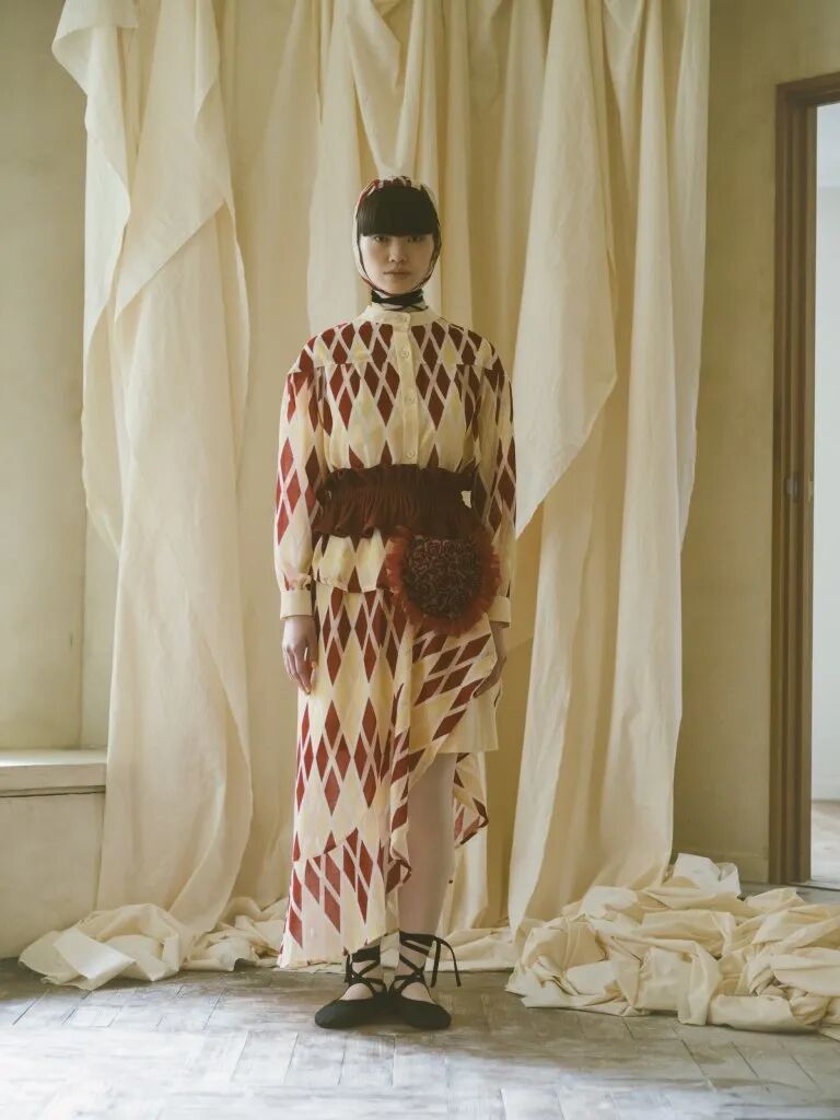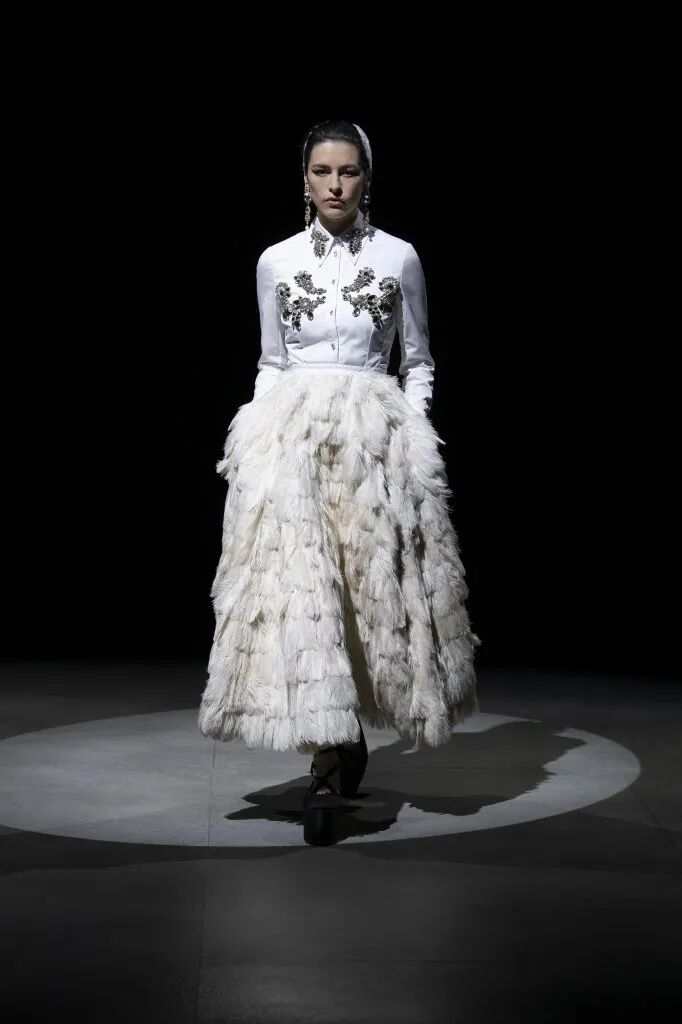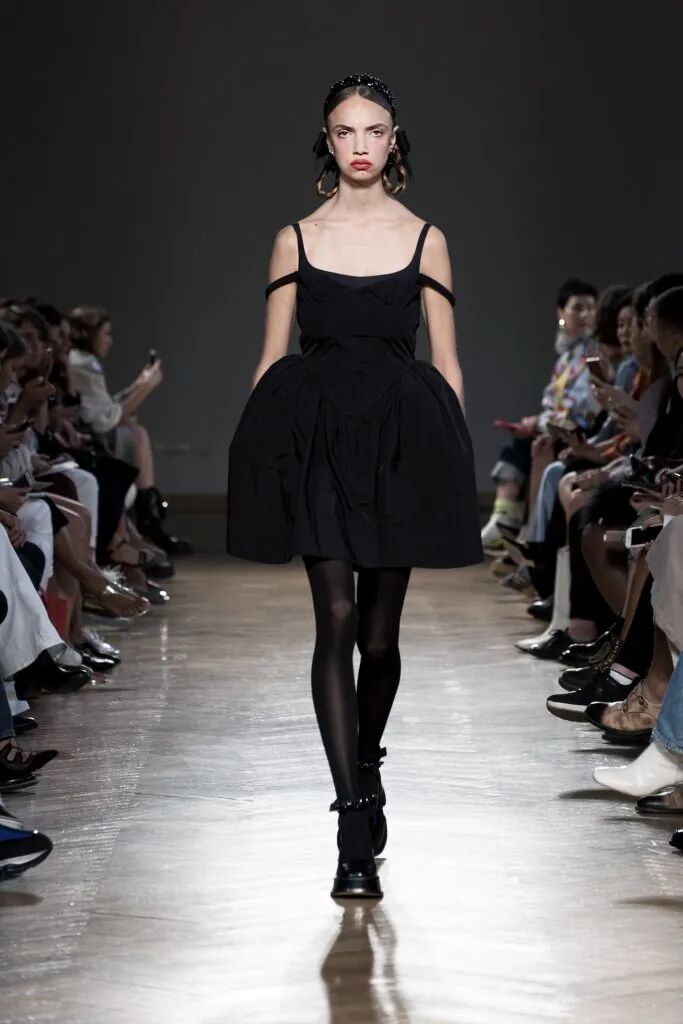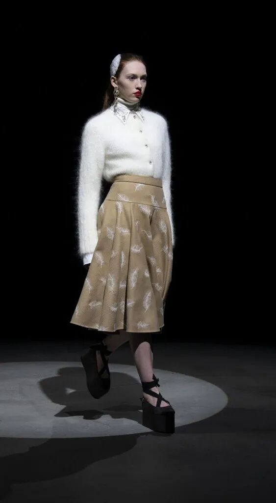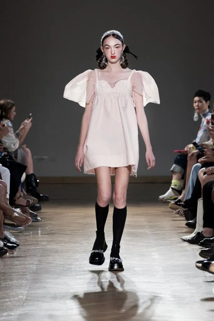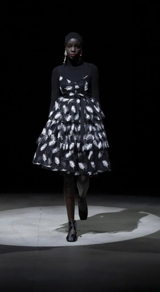 蓬鬆的裙襬靈感來源於芭蕾舞裙,皮鞋和芭蕾舞鞋被“雜交”在一起,與長襪的搭配,整套穿搭既優雅又復古,為精緻而浪漫的少女風服裝帶去一絲神秘的感覺。