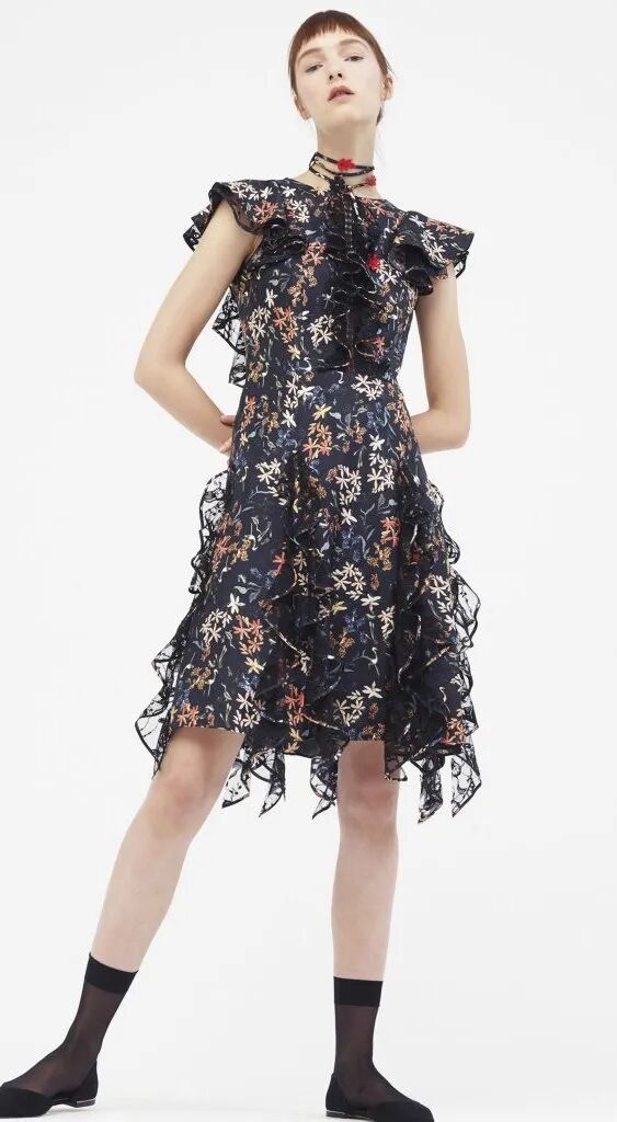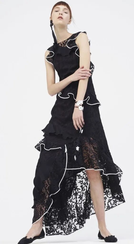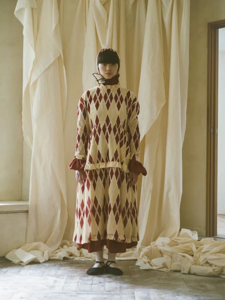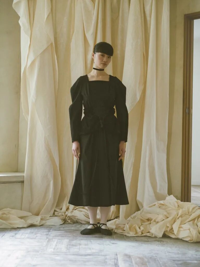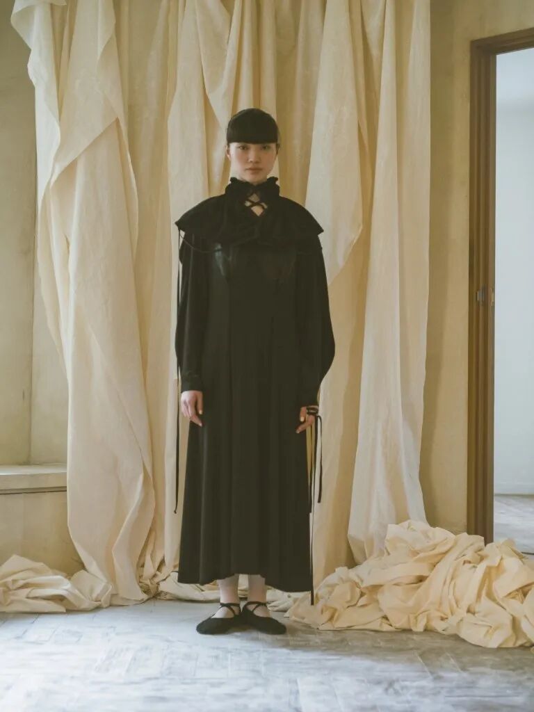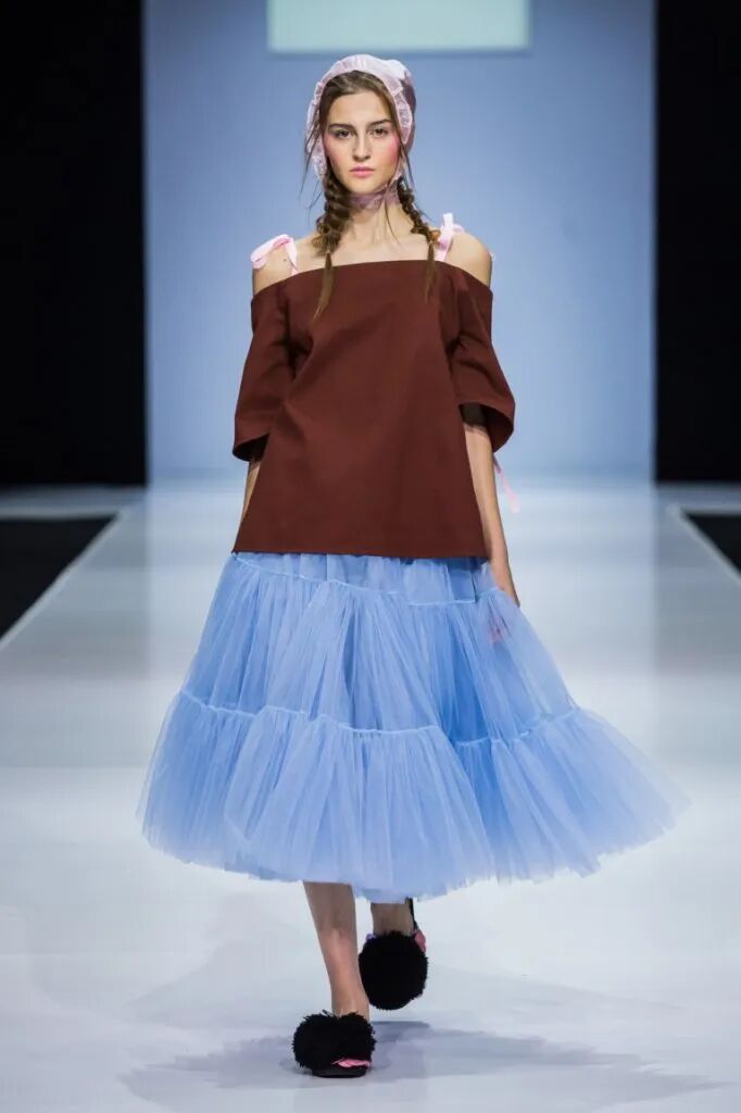 蓬鬆的裙襬靈感來源於芭蕾舞裙,皮鞋和芭蕾舞鞋被“雜交”在一起,與長襪的搭配,整套穿搭既優雅又復古,為精緻而浪漫的少女風服裝帶去一絲神秘的感覺。