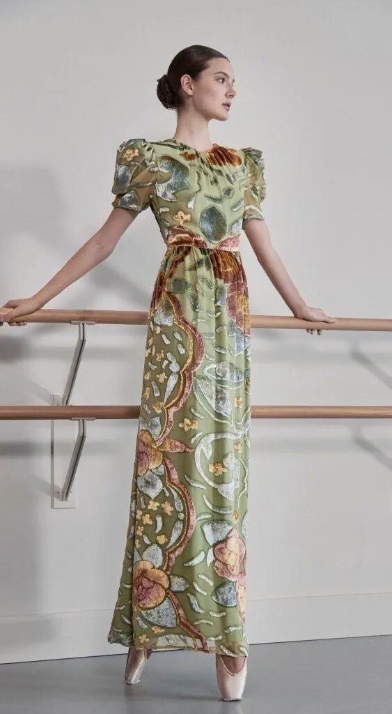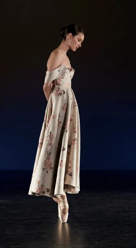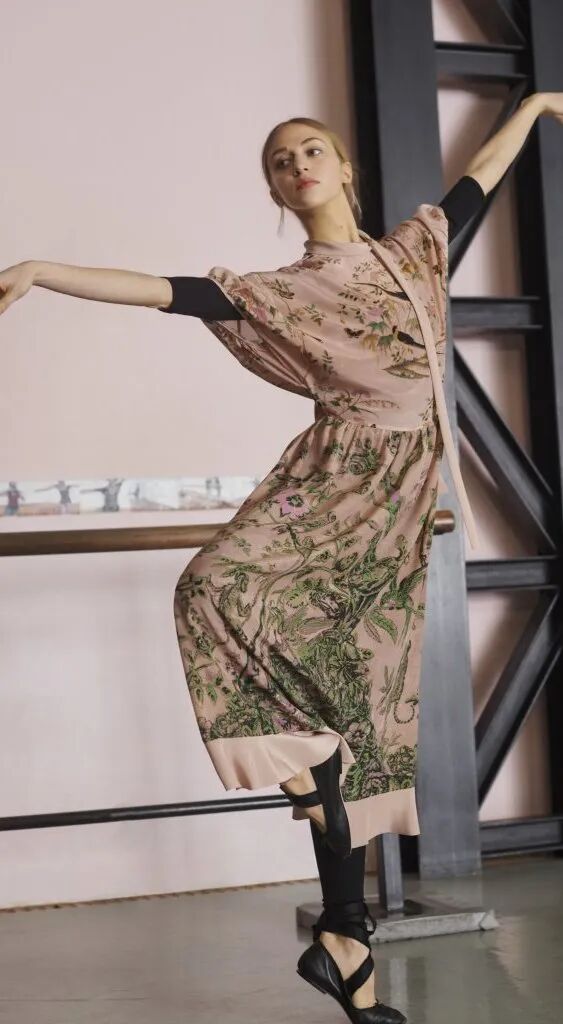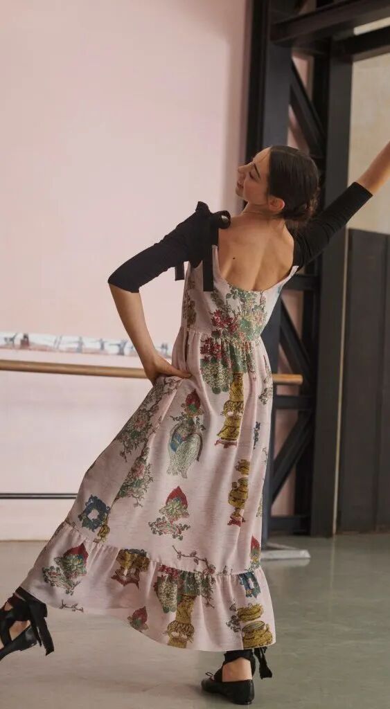 溫柔婉約是芭蕾風的集合基調,文藝是立足點,綢緞薄紗天鵝絨連衣長裙作為主打版型,搭配上芭蕾舞鞋,溫柔又有力量。
