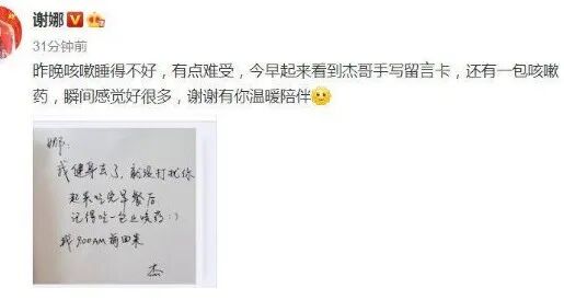 謝娜因咳嗽沒睡好,張傑會主動留言並在早上出門前貼心準備好止咳藥。