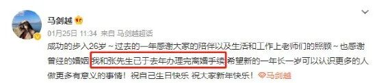 1月25日,90後女星馬劍越在自己26歲生日這天,官宣離婚——