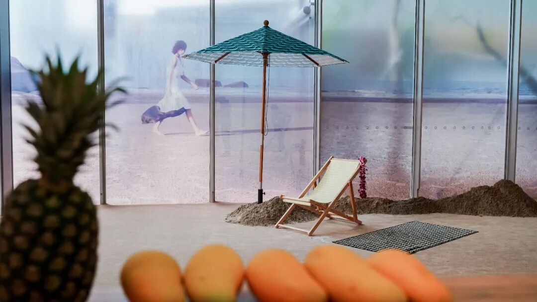 穿過登機口,進入展廳就像是置身於熱情的海灘之中,大海、日光浴躺椅和遮陽傘,浪漫自由又愜意,感受到呼之欲出的閒適與鬆弛,再享受一杯現場調製的雞尾酒,盡情感受夏日氣息