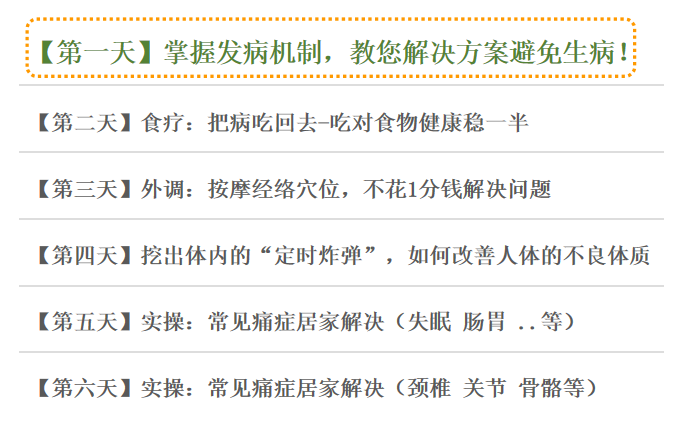 6天的講堂中,他會把常見的養生錯誤和正確的方式,全都告之於你,效果立竿見影。