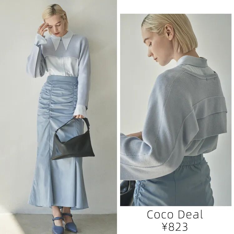 COCO DEAL這件是襯衫+針織裙的兩件套,兩個不同材質的灰調藍組合在一起也太溫柔啦!