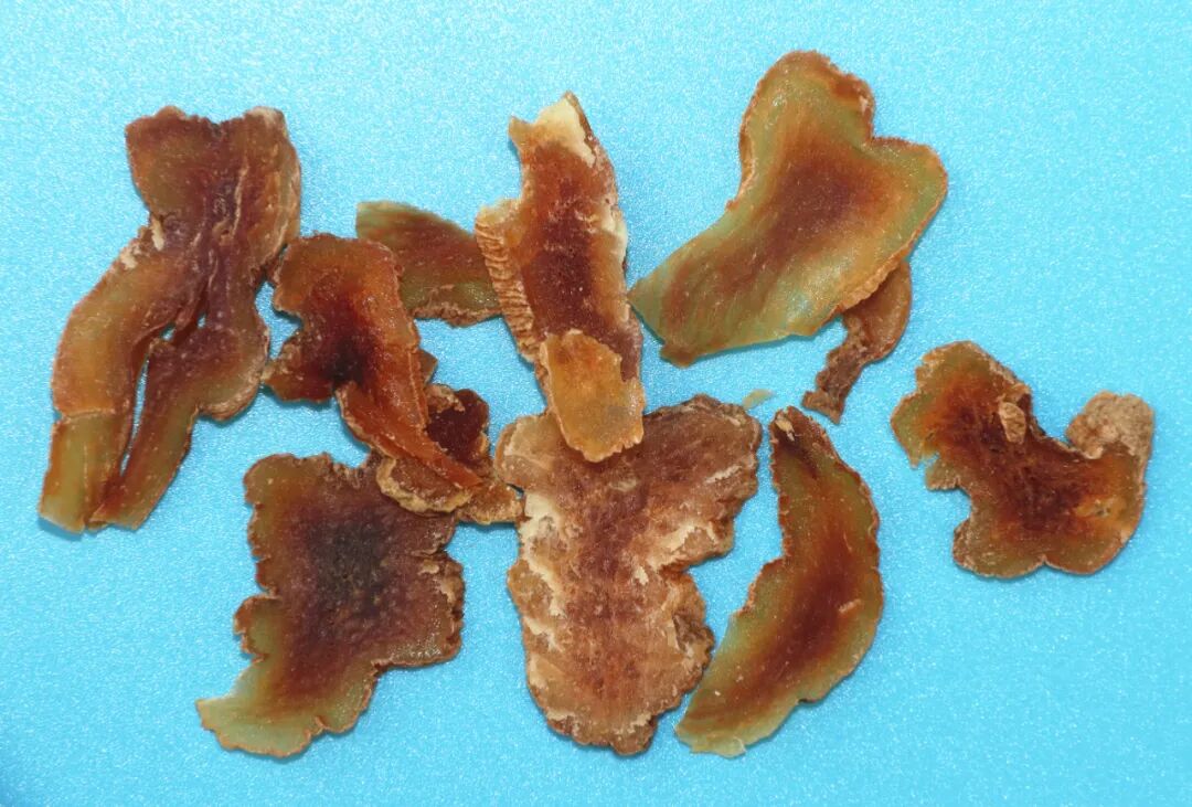⑥如用刨,則燻後,數層平鋪排列於方木桶內,用小於桶口的木板加重壓扁定形,約1天后取出鋪開,日攤夜悶至七成幹後,刨直薄片,曬乾,篩去灰屑即得。損耗10%~15%。