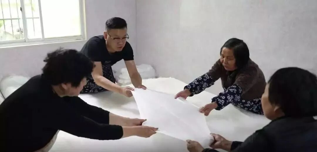 很多手藝人在拉綿的時候,人一站住,就不動了,機械化的一層層拉,其實這樣拉出來的蠶絲被很容易厚薄不均。老吳和蠶娘們拉綿的時候,會根據前幾層的厚度來調整站位和力道。