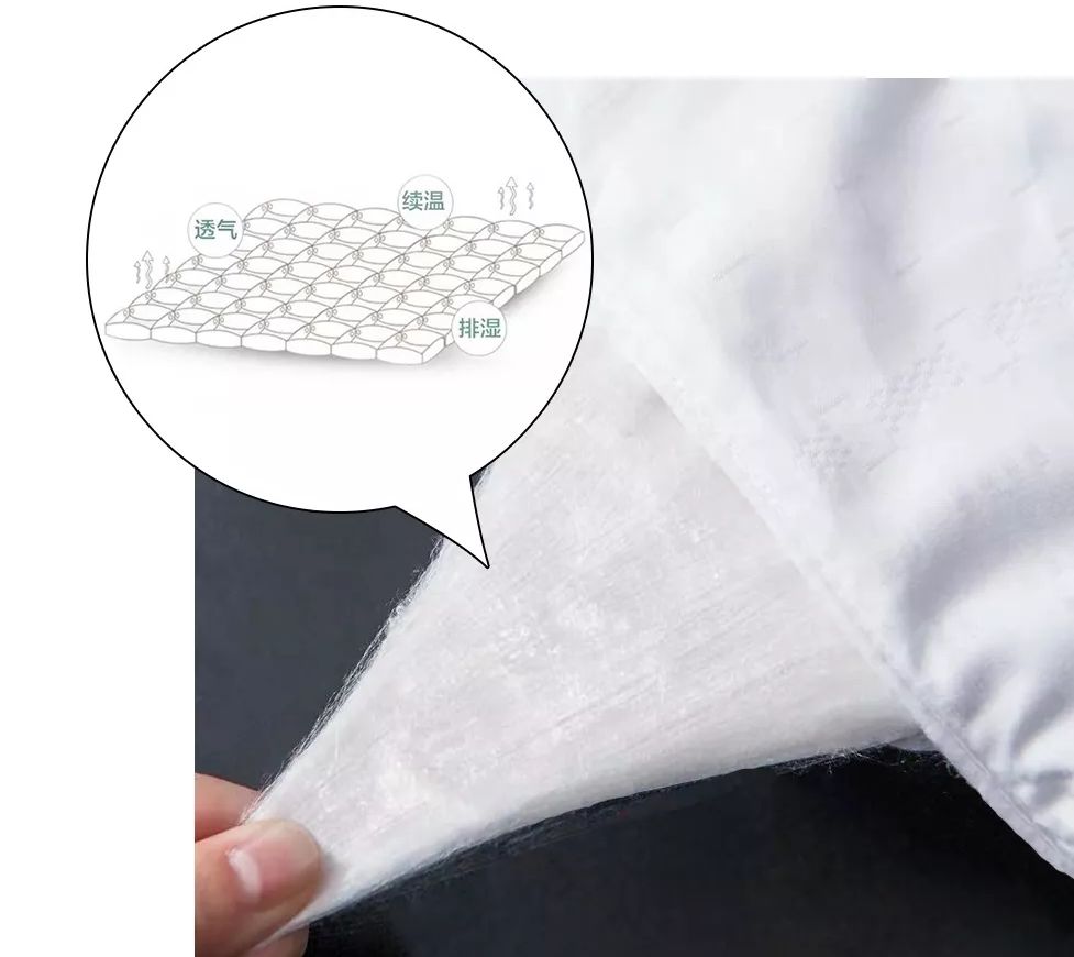 蠶絲中約98%的成分是純天然動物蛋白,跟人體皮膚非常接近。對有呼吸道不適問題的人來說,蠶絲被能減少短纖維、塵埃對呼吸道的刺激。此外,蠶絲被非常貼體,睡覺時還能保護雙肩。