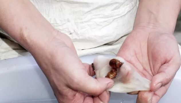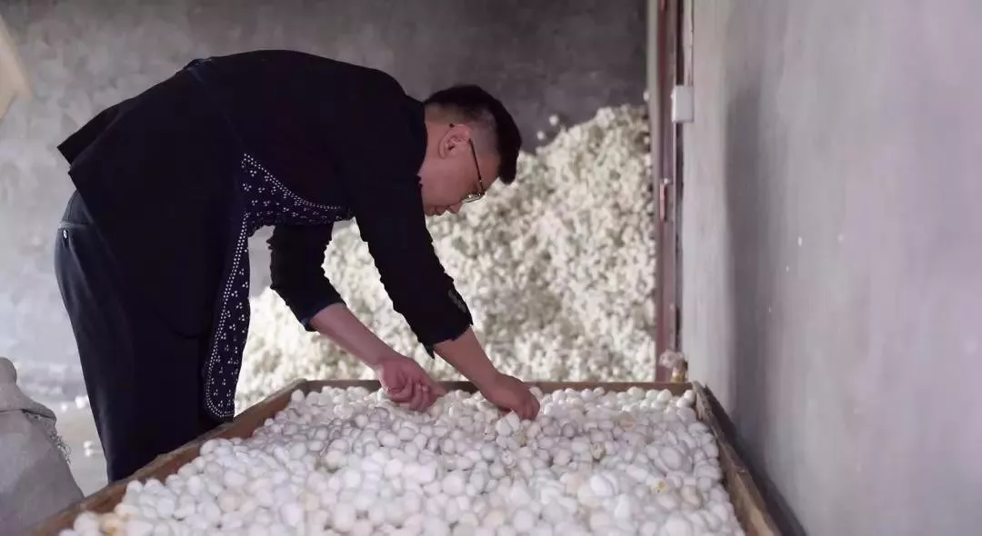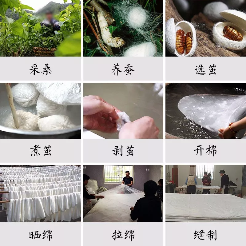 選養的蠶也不是普通的桑蠶,而是優中選優、個頭飽滿的雙宮繭–秋豐白玉,所成蠶繭繭形大,繭色白淨,養出來的蠶繭都是“天然雙宮繭”,每一個繭剝開來有兩個蠶寶寶的兩隻蠶吐得絲交錯纏繞形成的蠶繭,比單宮繭更保暖更緊實。