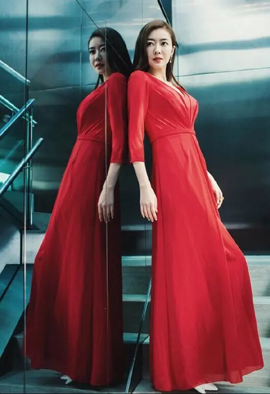 一襲紅色長裙勾勒出玲瓏身姿,超高腰線也給我們打造出一種胸部以下全是腿的即視感!