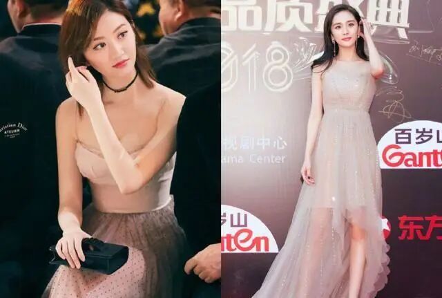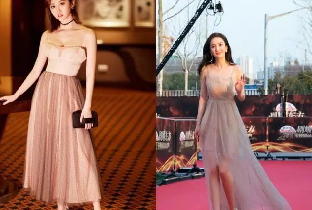 但是她的對手楊冪可不弱,號稱時尚大咖的楊冪選擇的也是一件肉色的吊帶紗裙。