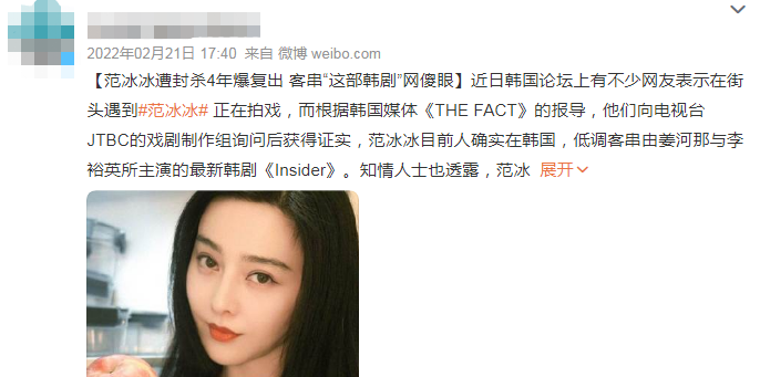 根據韓國媒體《THE FACT》的報導,他們向電視臺JTBC的戲劇製作組詢問後獲得證實,范冰冰奔赴韓國客串了由姜河那與李裕英所主演的最新韓劇《Insider》。