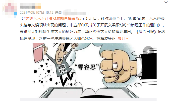 因為就像《法制日報》寫得那樣:“之所以成為劣跡藝人,是因為其觸犯道德底線乃至違法犯罪,如果讓劣跡藝人再次引流、流量變現,會導致一些低齡粉絲樹立錯誤的價值觀和消費理念,因此必須嚴懲劣跡藝人。”