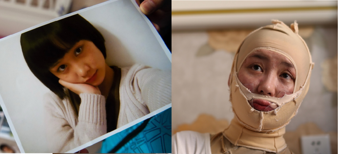臉部、頸部、胸部嚴重燒傷,一隻耳朵也燒掉了,全身燒傷面積高達28%。