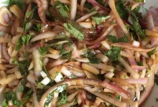 用陳醋、鮮味醬油、白糖和雞精將洋蔥和花生米拌勻,10分鐘後即可以食用。