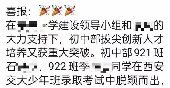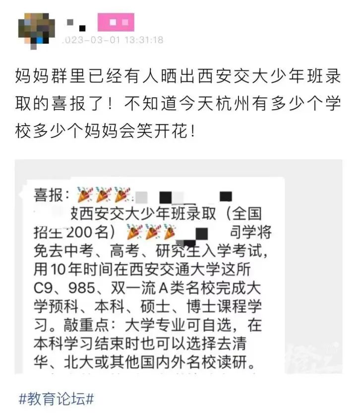 在橙柿互動的教育論壇裡,有位橙友曬出了喜報截圖,說:“媽媽群裡已經有人曬出西安交大少年班錄取的喜報了!不知道今天杭州有多少個學校多少個媽媽會笑開花!”