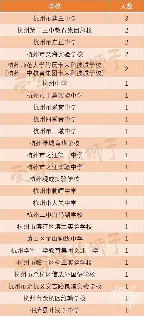 今年,據橙柿互動記者不完全統計,來自20多所初中學校,除了建蘭中學、啟正中學、觀成實驗學校、杭州二中白馬湖學校等民辦學校或民轉公學校,繼續保持優勢外,還有不少公辦學校強勢上榜。