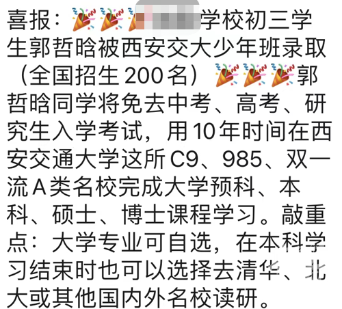 西安交大“少年班”的招生特色是“一考免三考”——免中考、高考、研究生考試,8年獲得碩士學位。