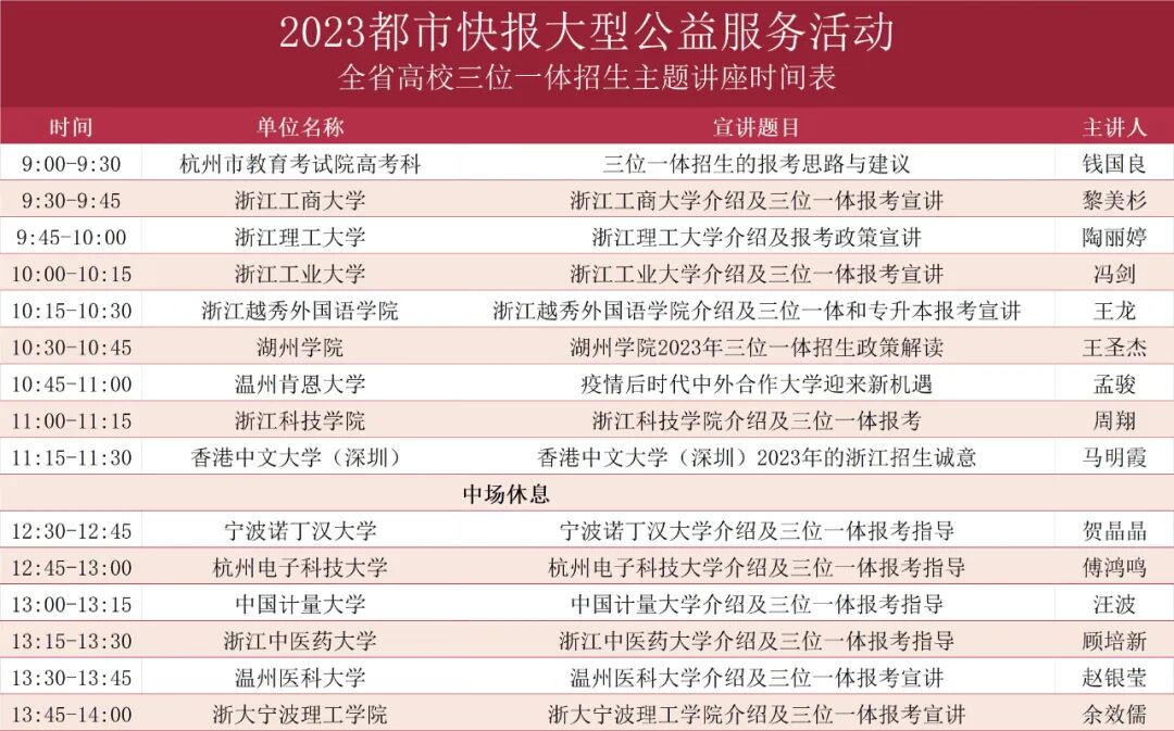 為了更好地服務全省考生,本週六(3月4日),都市快報舉辦2023年大型公益服務活動——全省高校三位一體招生諮詢會。省內30多所高校以及香港中文大學(深圳)招生負責人到現場為考生提供一對一的諮詢和指導服務,歡迎高中生家長掃碼報名參加。